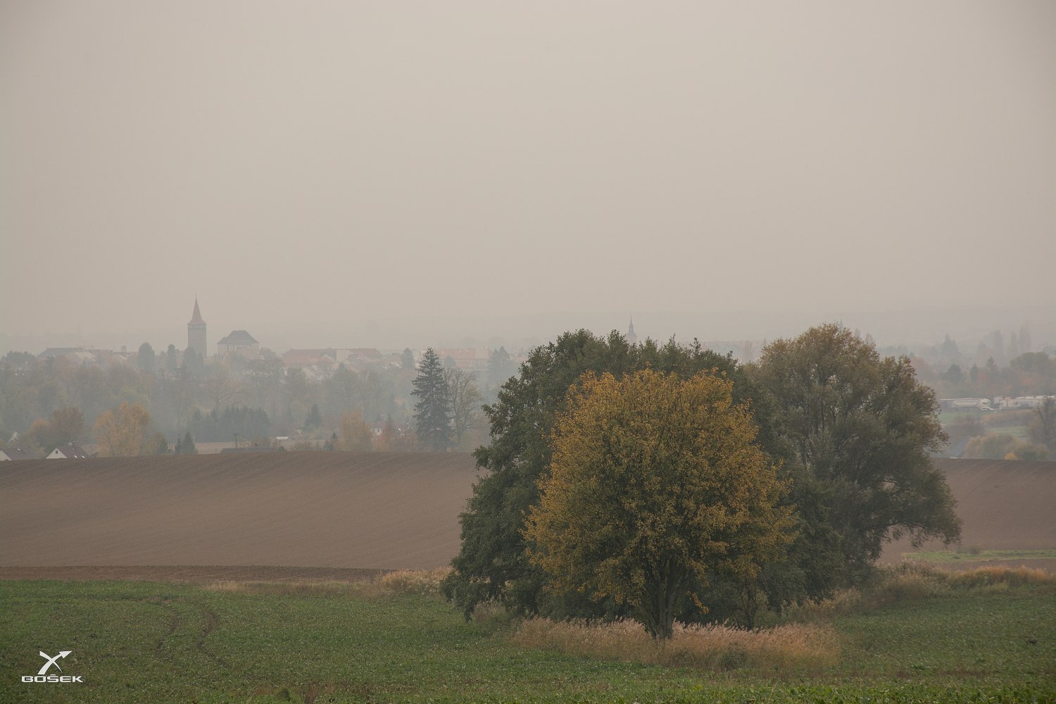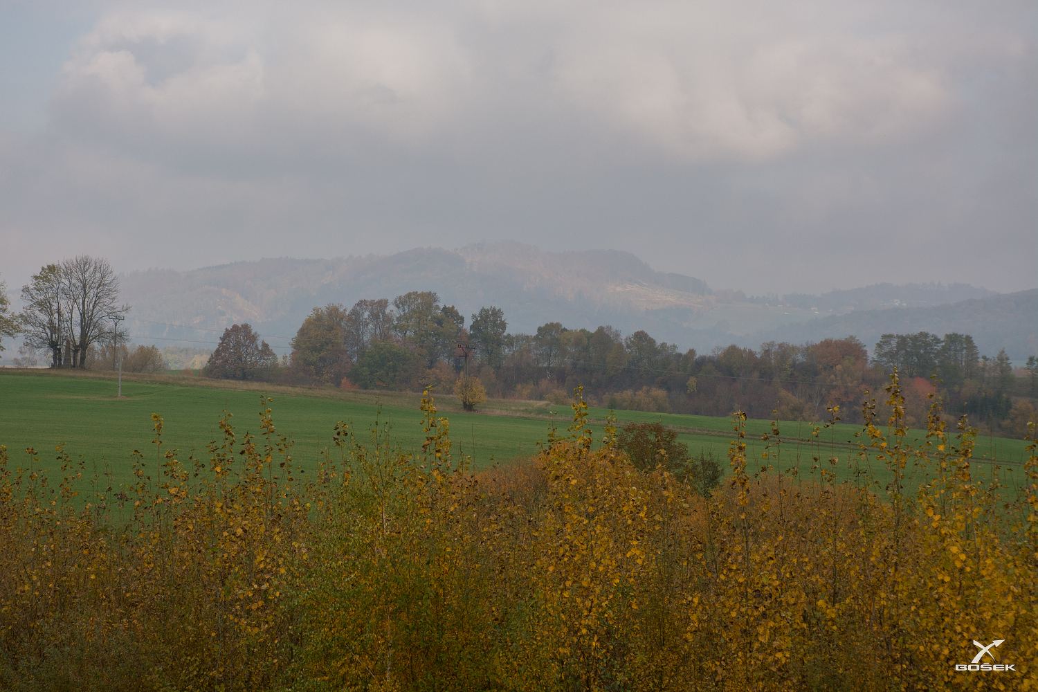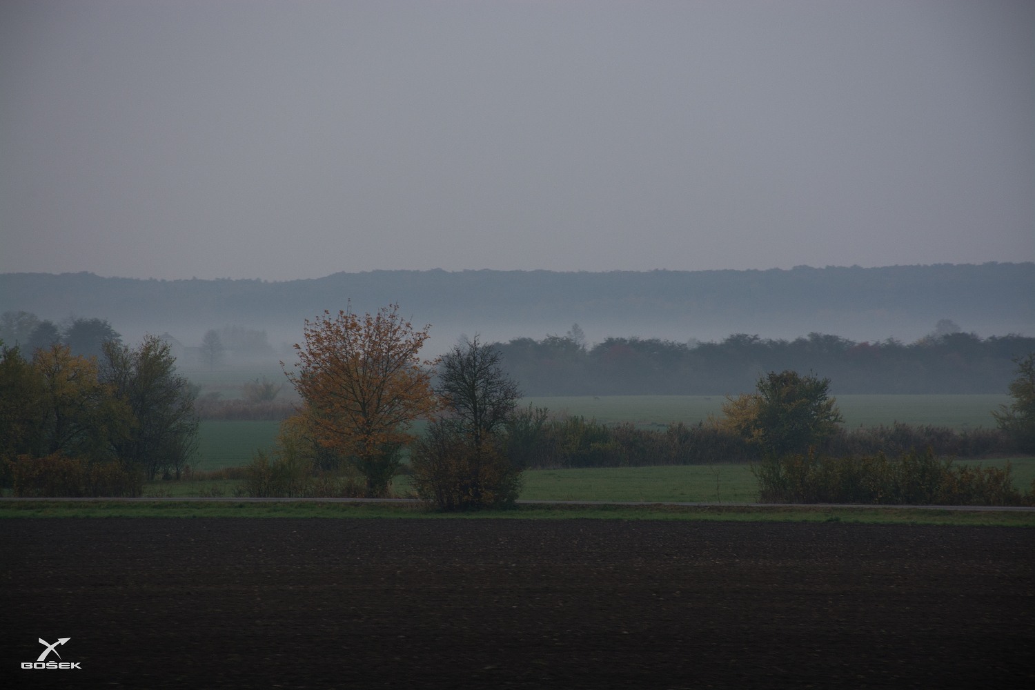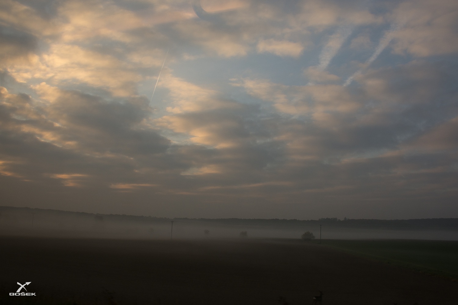 Všude se na loukách válí mlha, slunce nemá moc šancí proniknout skrz. Prostě podzim. Příroda se odsud jeví fádní, ale mraky mají nádhernou barvu.