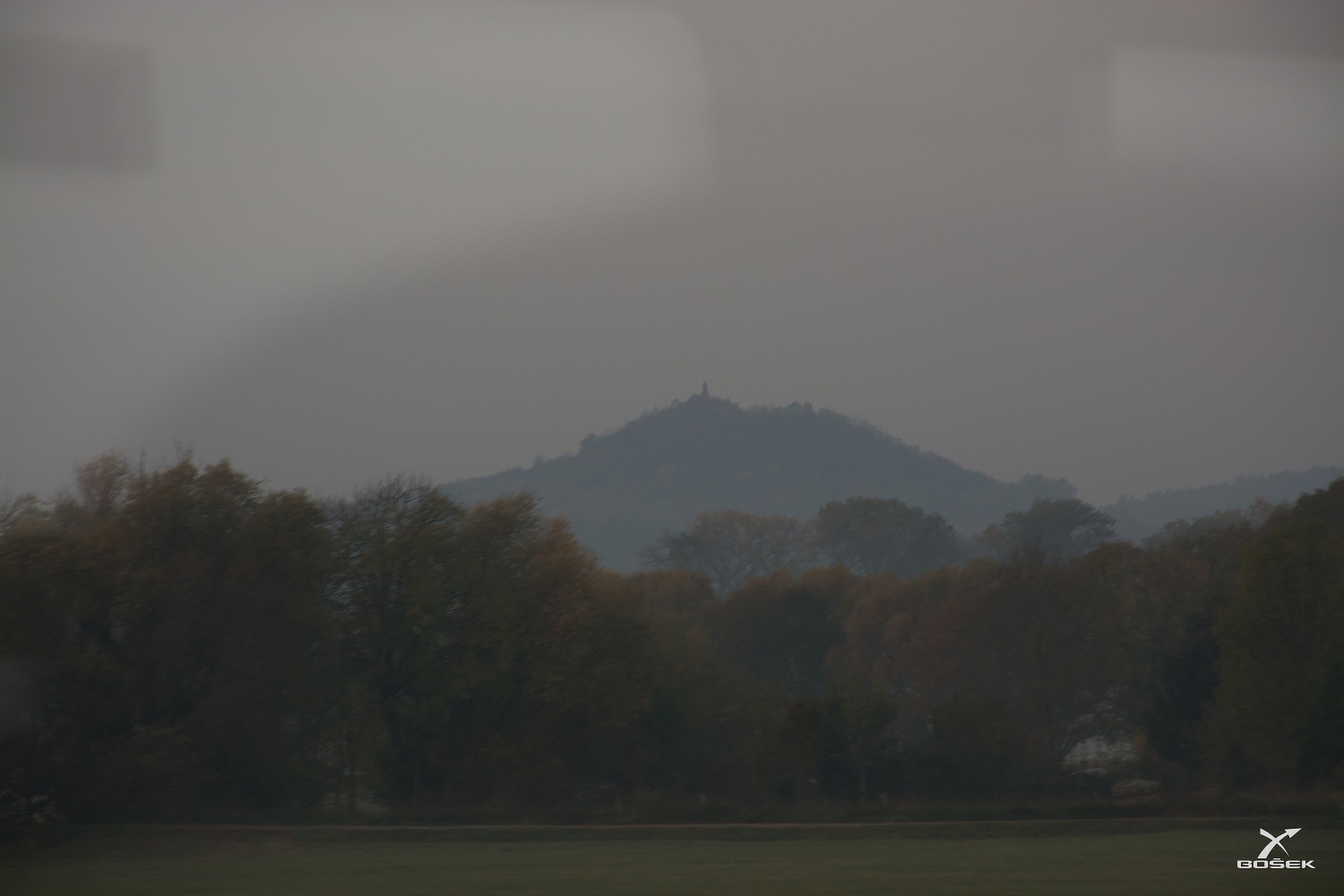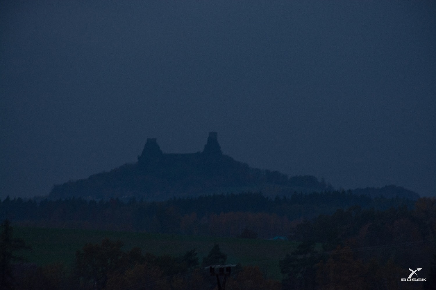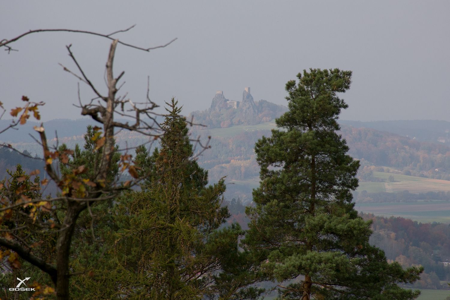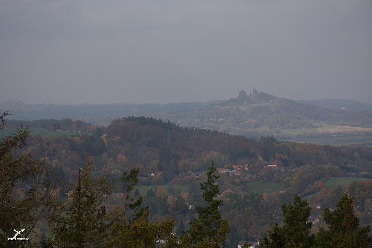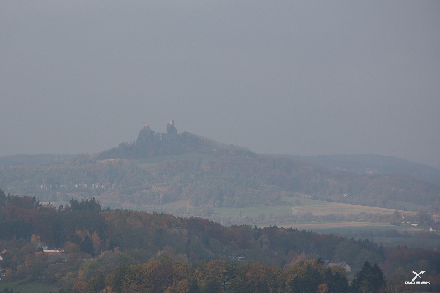 Tu trosku z pozadí fotky s Hrochem jsem si ještě přitáhl. Poprvé vidíme tuhle další dominantu Českého ráje. Na Trosky dokonce svítí chvílema sluníčko, ale je zapšklo.