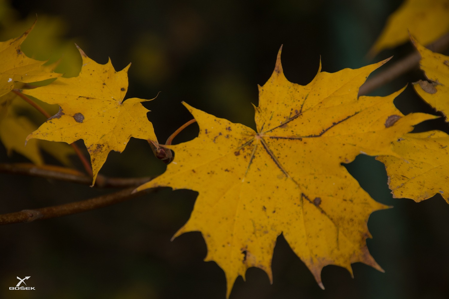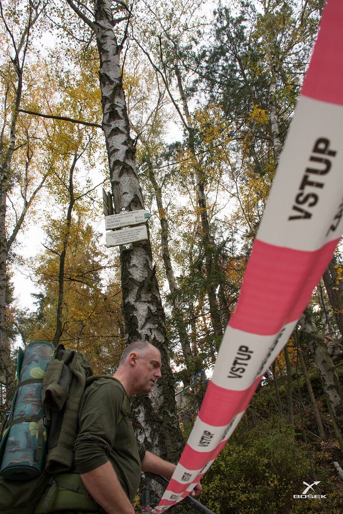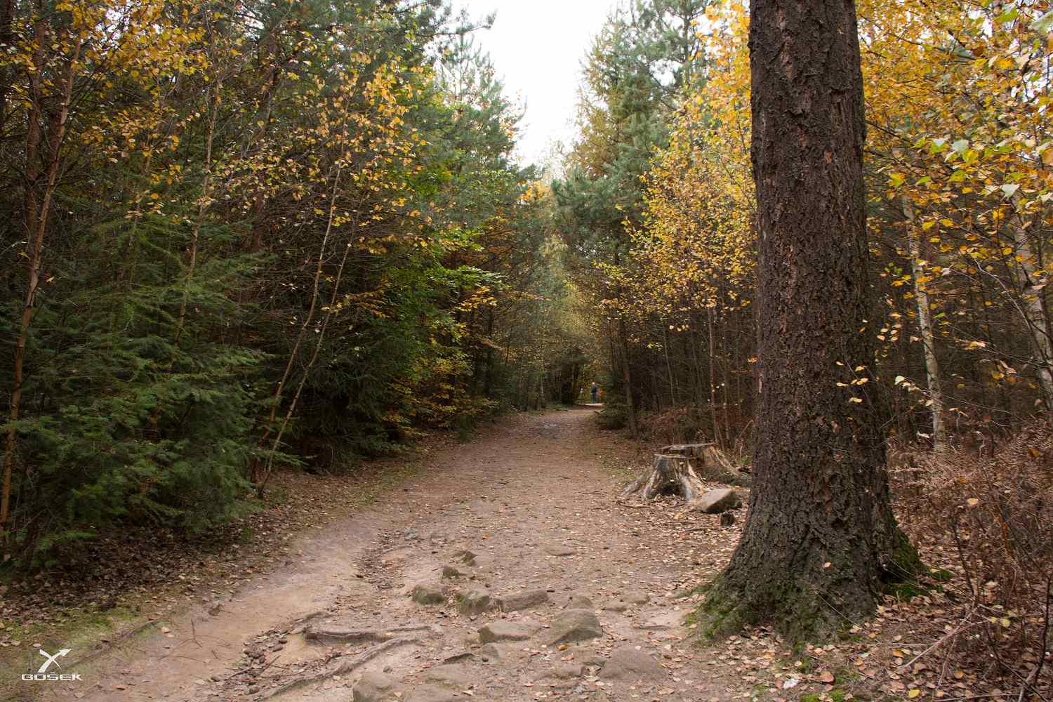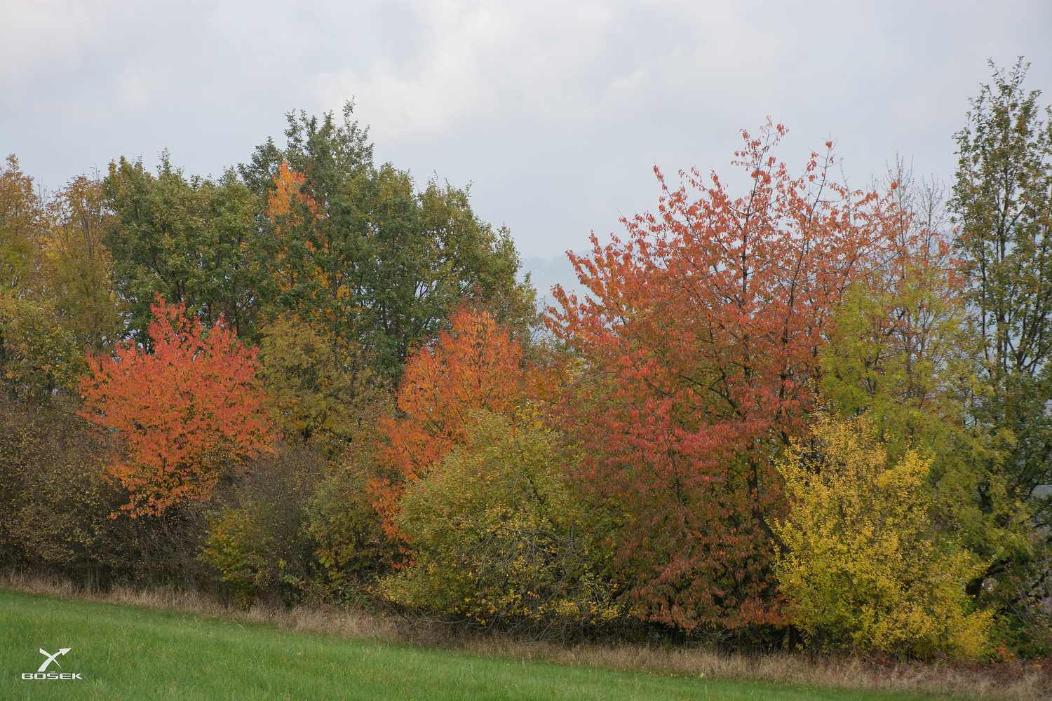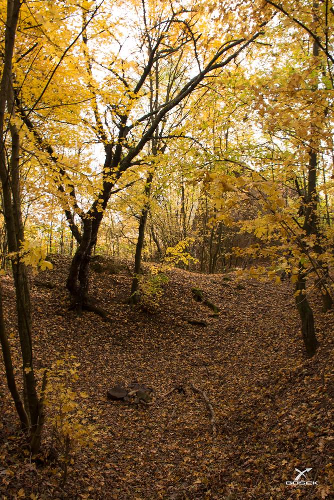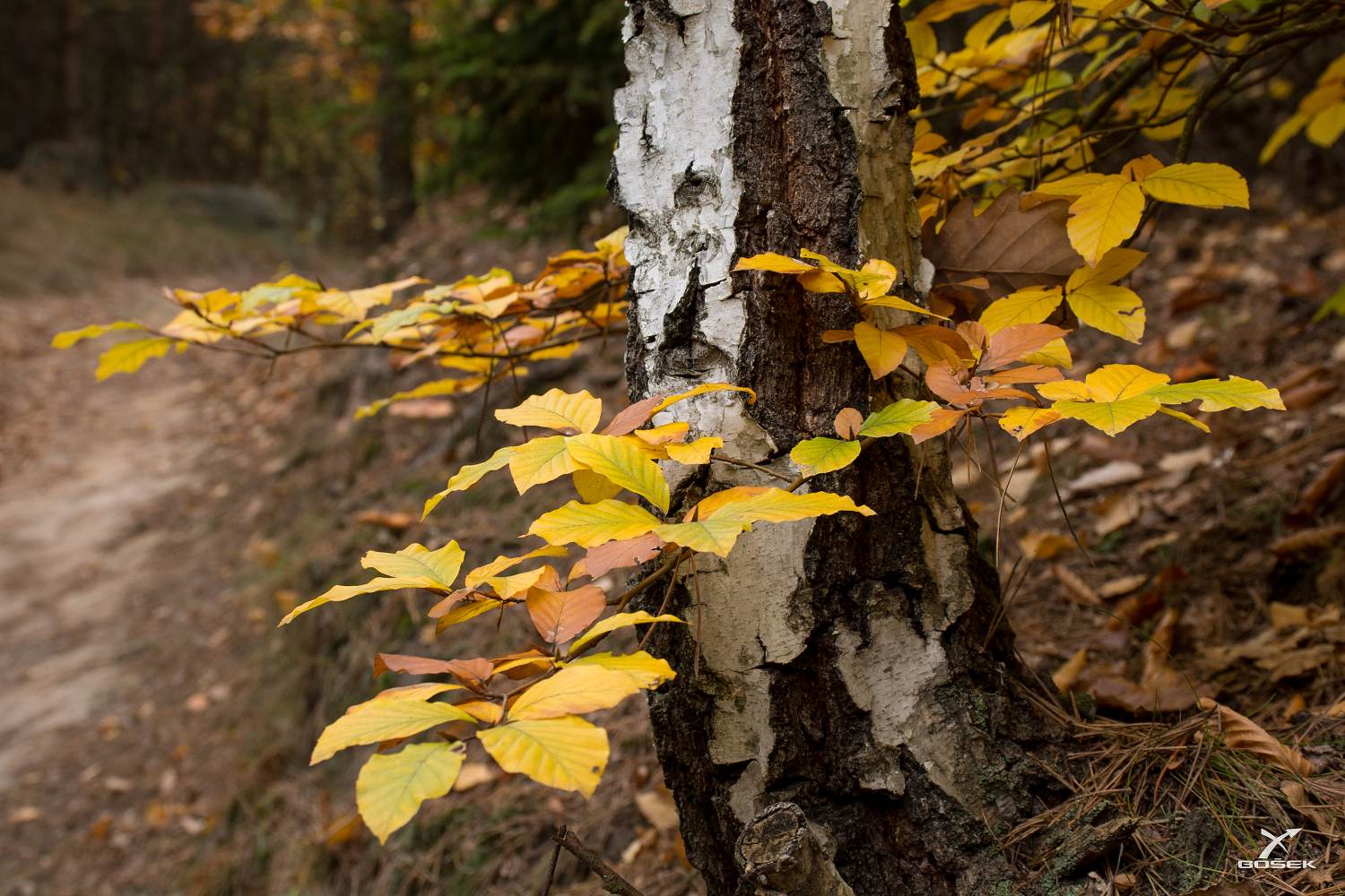 Slézáme na modrou a potom stoupáme po zelené. Zaujal mě kontrast zlaté bukových listů s bílo černou borkou břízy. Kluci už mi zase utekli, když jsem tu klečel a vymýšlel kompozici. Ale to mi nevadí, já je doženu.