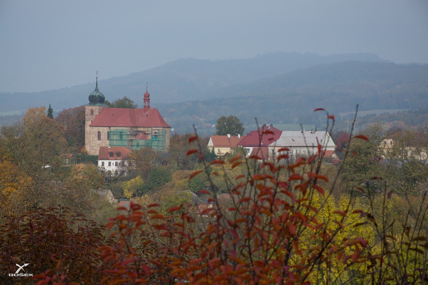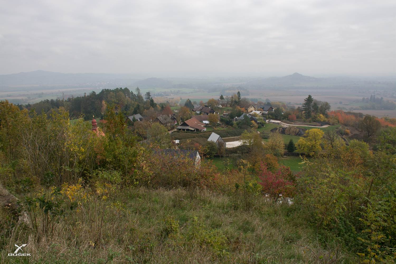 Skoro nahoře a kousek stranou od trasy na mě Simír volá: „Bošku, odsud je krásnej výhled na Železnici a její kostel.“