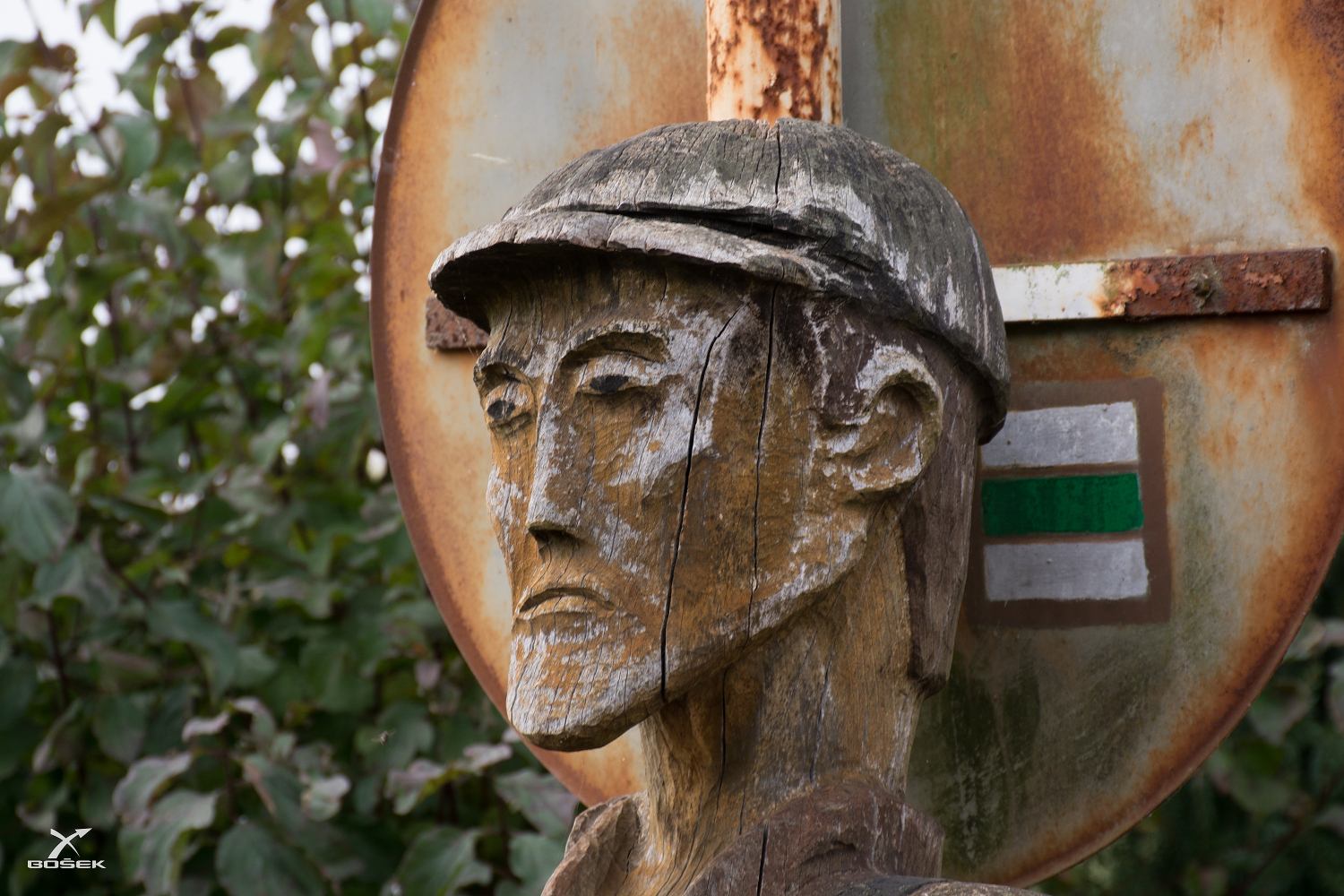„Ten má celkem povedenej obličej,“ znalecky komentuje sochu řezbář Simír. Jsme za pilou kousek od Železnice, takže to asi sochal někdo z místních pracovníků.