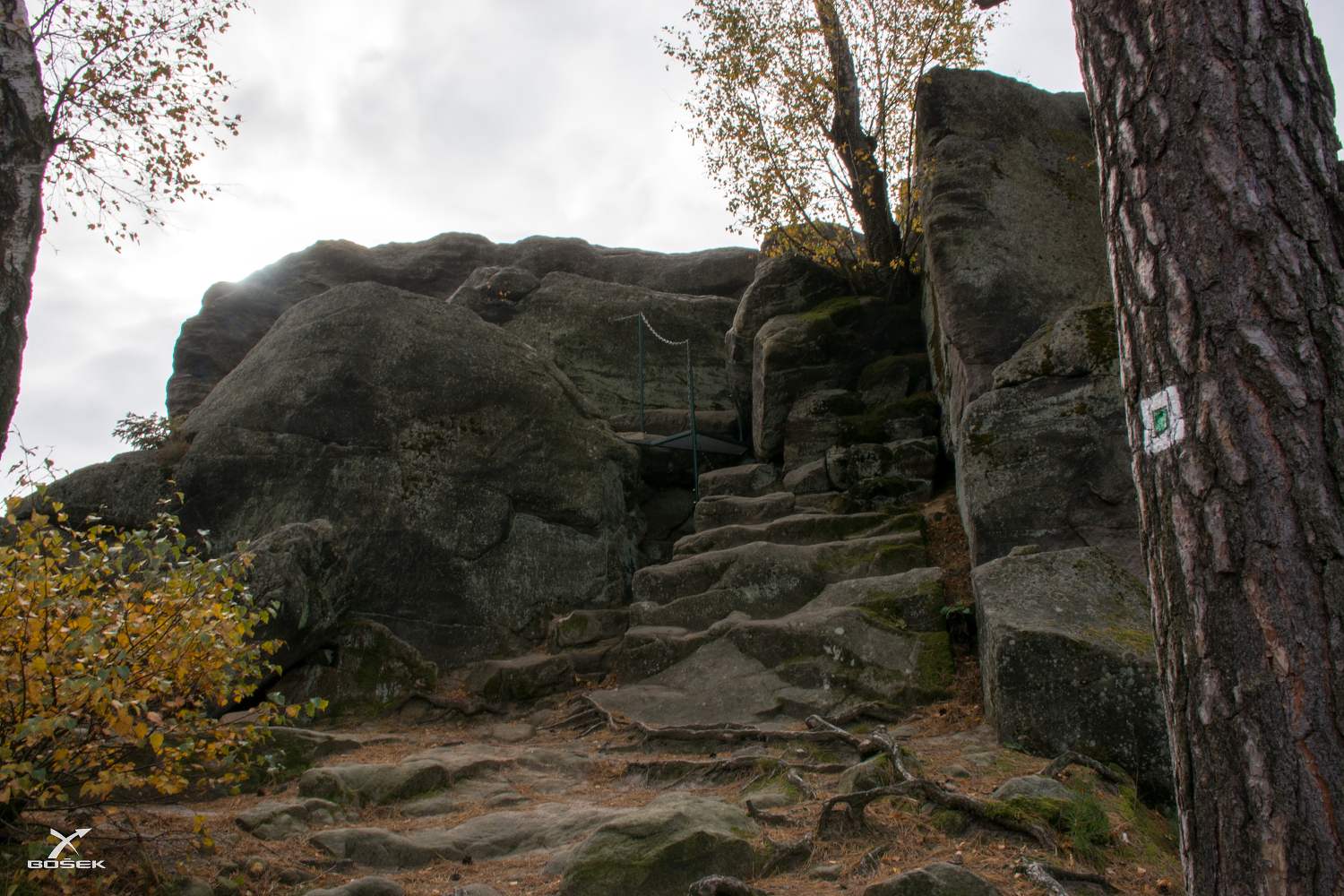 Stezka potom kličkuje mezi skalami a sem tam je zpevněná dřevěným chodníčkem. Vzpomněl jsem si na můj čundr v Broumovkách.