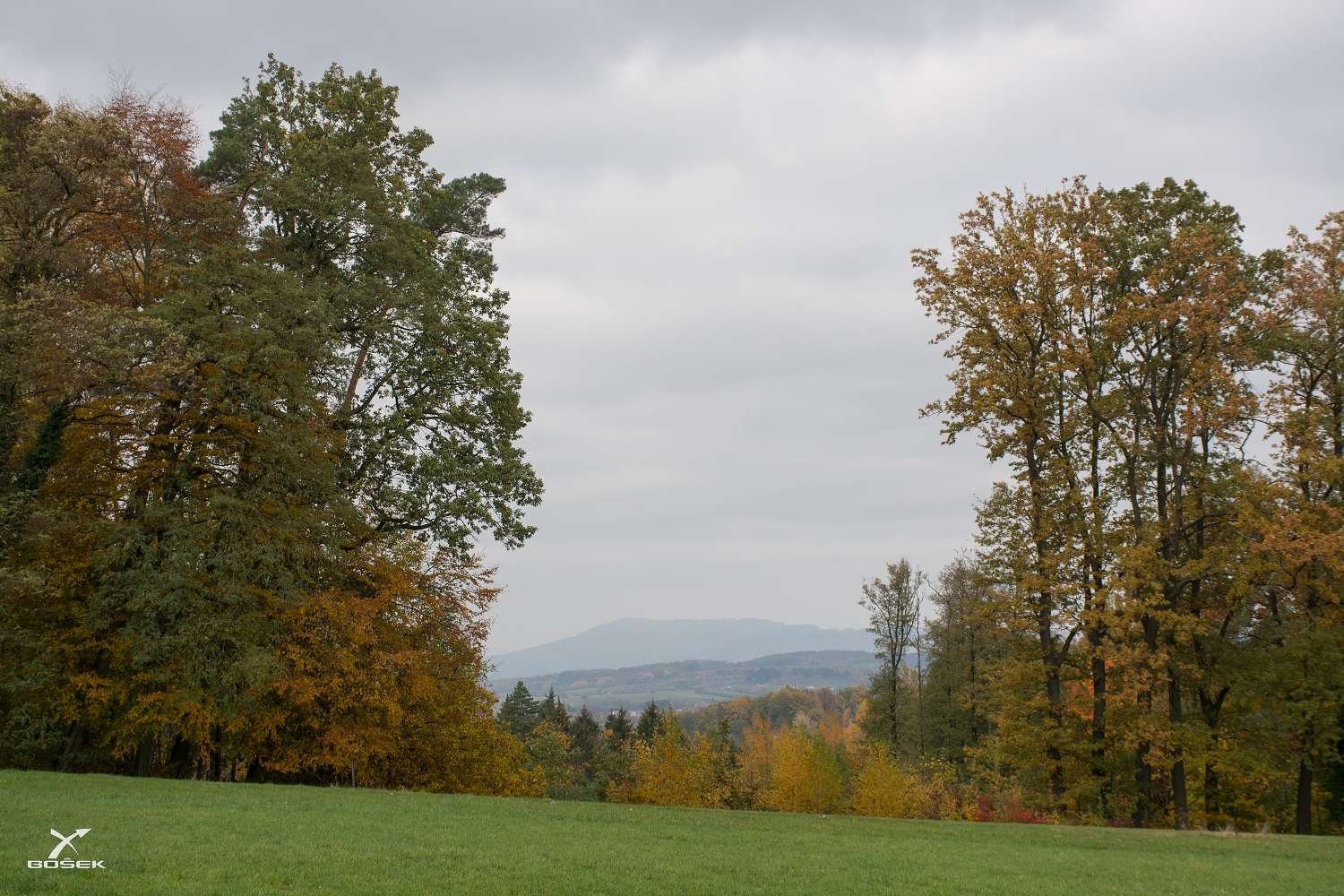 Jsem na hranici lesa a ohlížím se. Je tu krásný výhled na Zebín, Čeřovku a Veliš lemovaný krásně zbarvenými listnáči.
