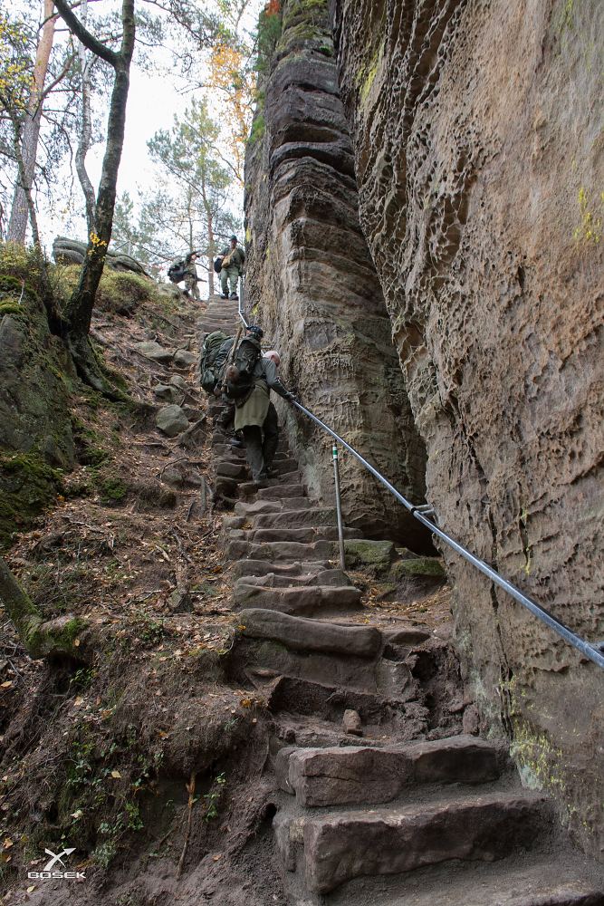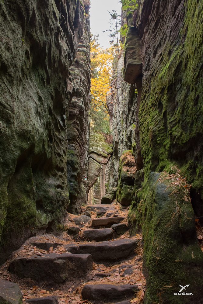 Procházíme úzkým skalním průchodem s názvem Fortna. V pískovcových stěnách jsou prý vyryté záhadné obrazce, jejichž původ není dodneška zcela vysvětlený. To jsem se dočetl až teď při psaní. Při prolejzání jsem si ničeho nevšimnul. Asi jsou někde výš.