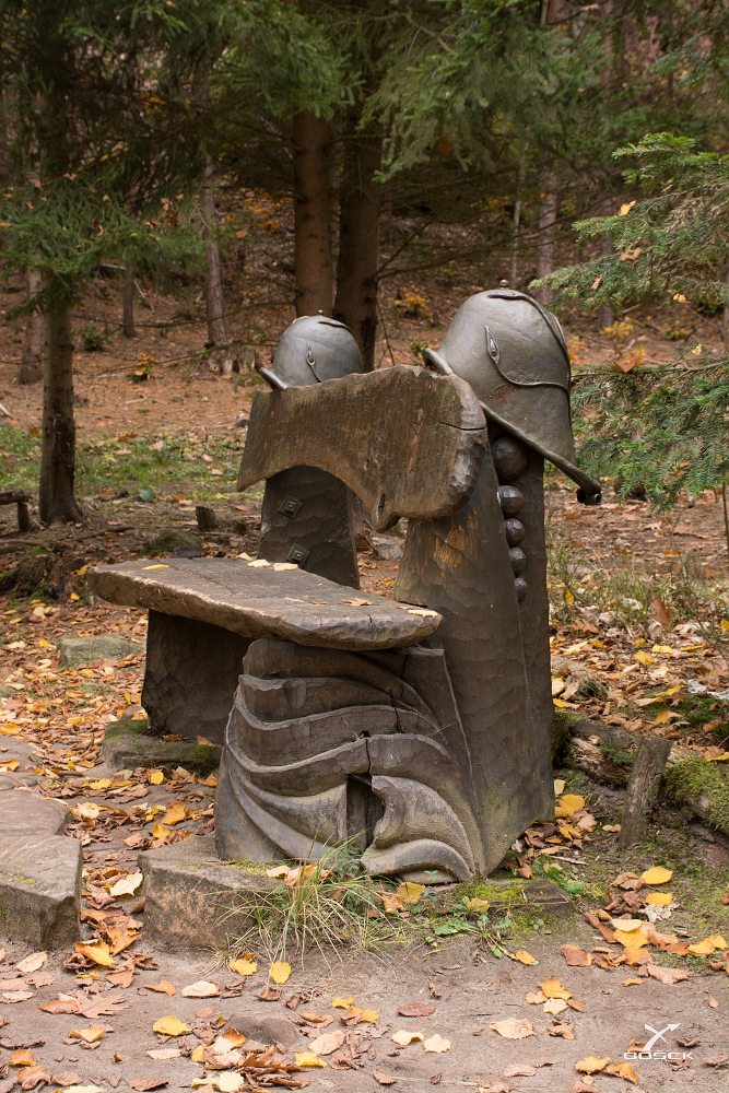 Dole v rokli je vyřezaný totem ze stoletého prachovského buku a znázorňuje Pelíška. To je takový místní Krakonoš. Ale ten totem fotí určitě každý. Mě zaujala ale tahle lavička vedle. Nikde jsem se ale nedopátral, proč jsou na ní ty přilbice.