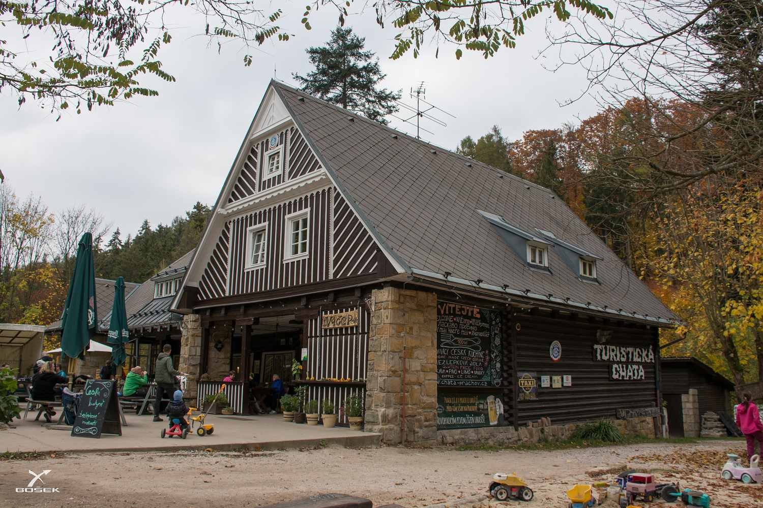 Jsou tři odpoledne a tohle je náš pozdně obědový cíl, Turistická chata Prachov. Ta letos slaví neuvěřitelných sto let. Vznikla na místě původní dřevěné lesní restaurace Ve sklípku postavené v roce 1886.