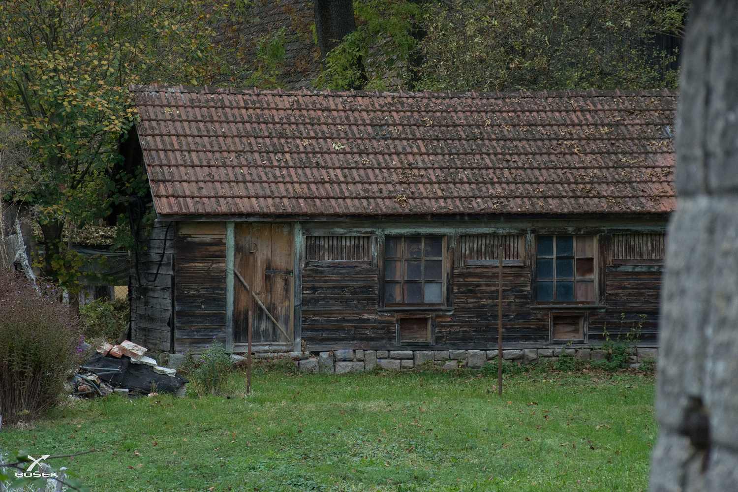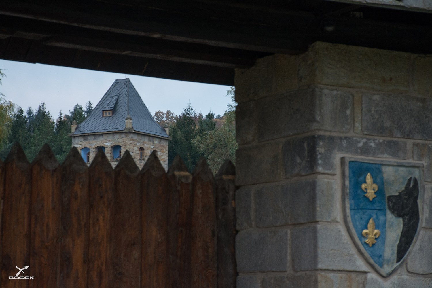 Přicházíme do Zámostí. Tady hned na začátku vidím za polorozpadlou dřevěnou bránou krásný kontrast k honosnému zámečku z minulé vesnice.