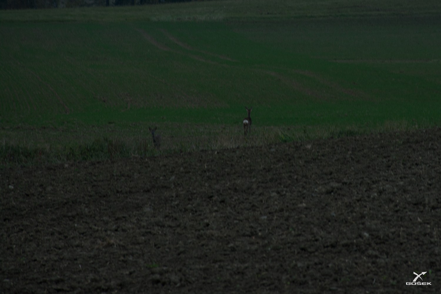 Už se fakt setmělo. Na poli jsme vyplašili dvě srnečky pasoucí se na ozimu. Jedna ještě chvíli na nás kouká, ale pak peláší za tou první.
