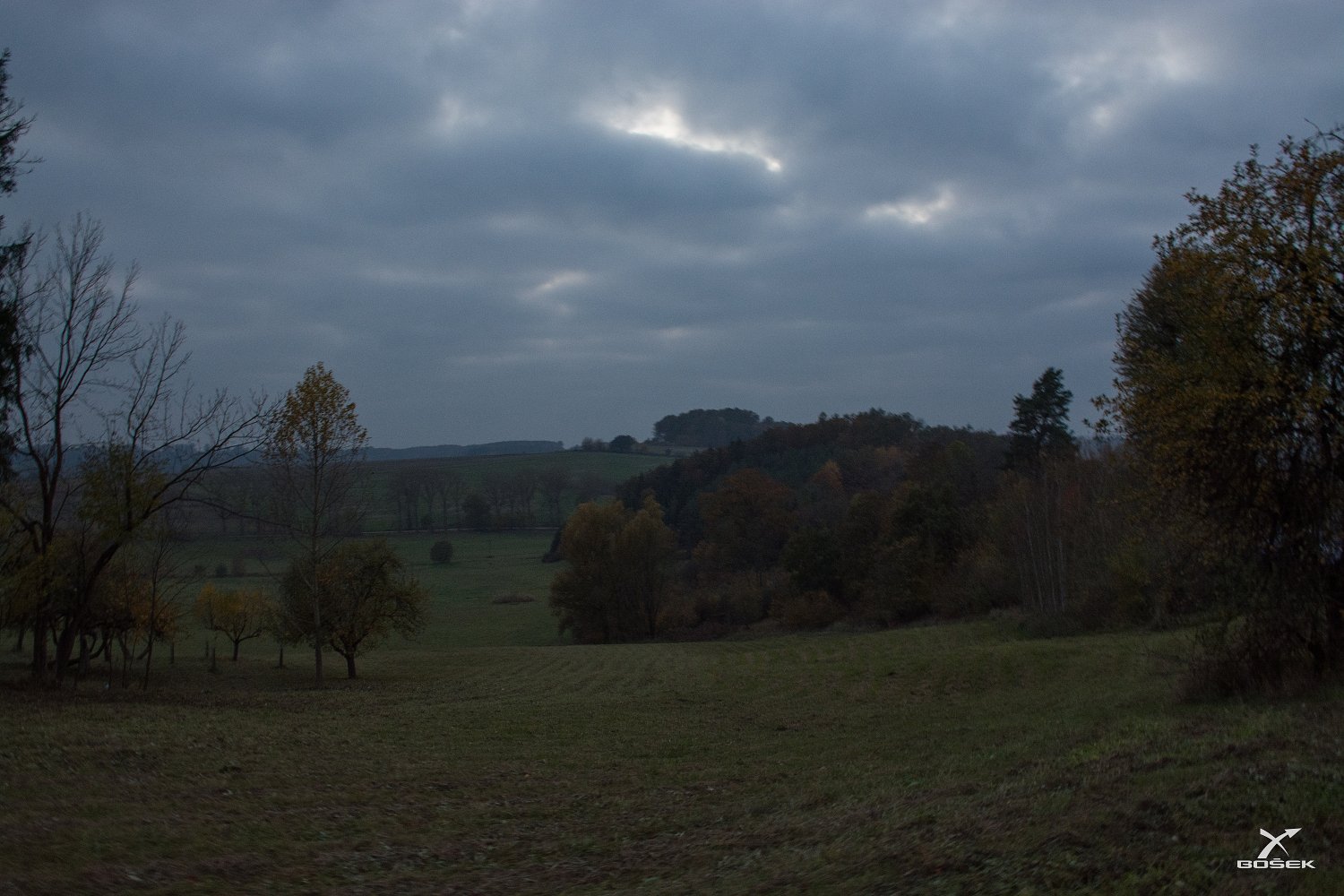 Vyšli jsme na otevřené prostranství a tady je vidět, proč byla v lese taková tma. Dost se zatáhlo a taky se už skoro stmívá.