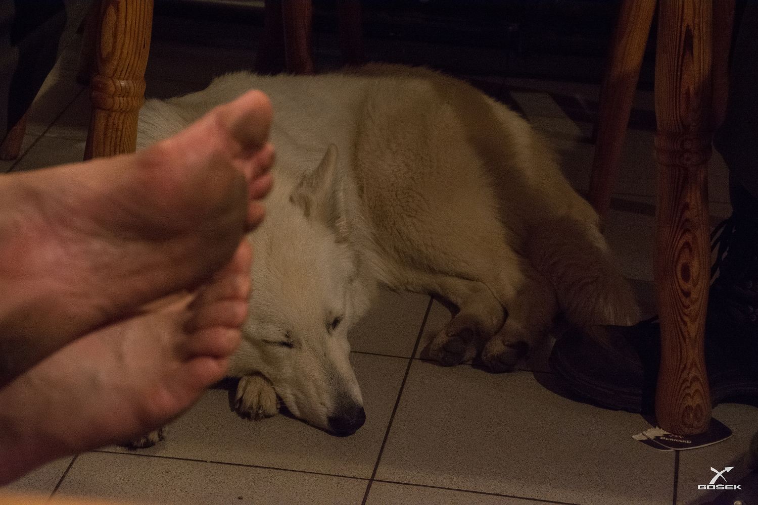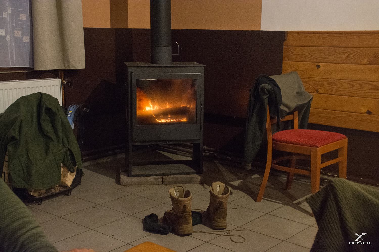 Jsme v teplíčku a Vlastík si s dovolením paní hospodské zul boty a suší je. Měl je totiž po tom běhání skrz Cidlinu ještě totálně durch.