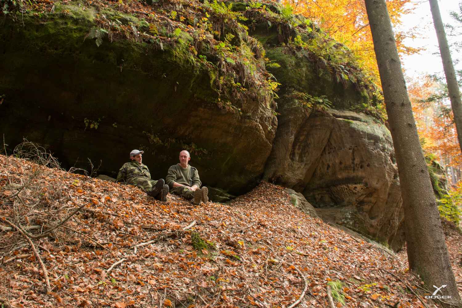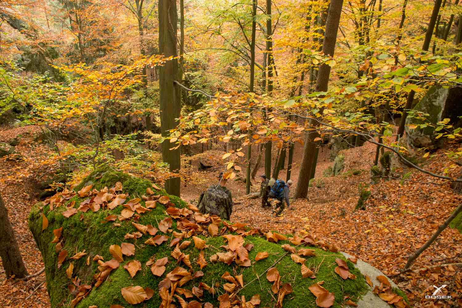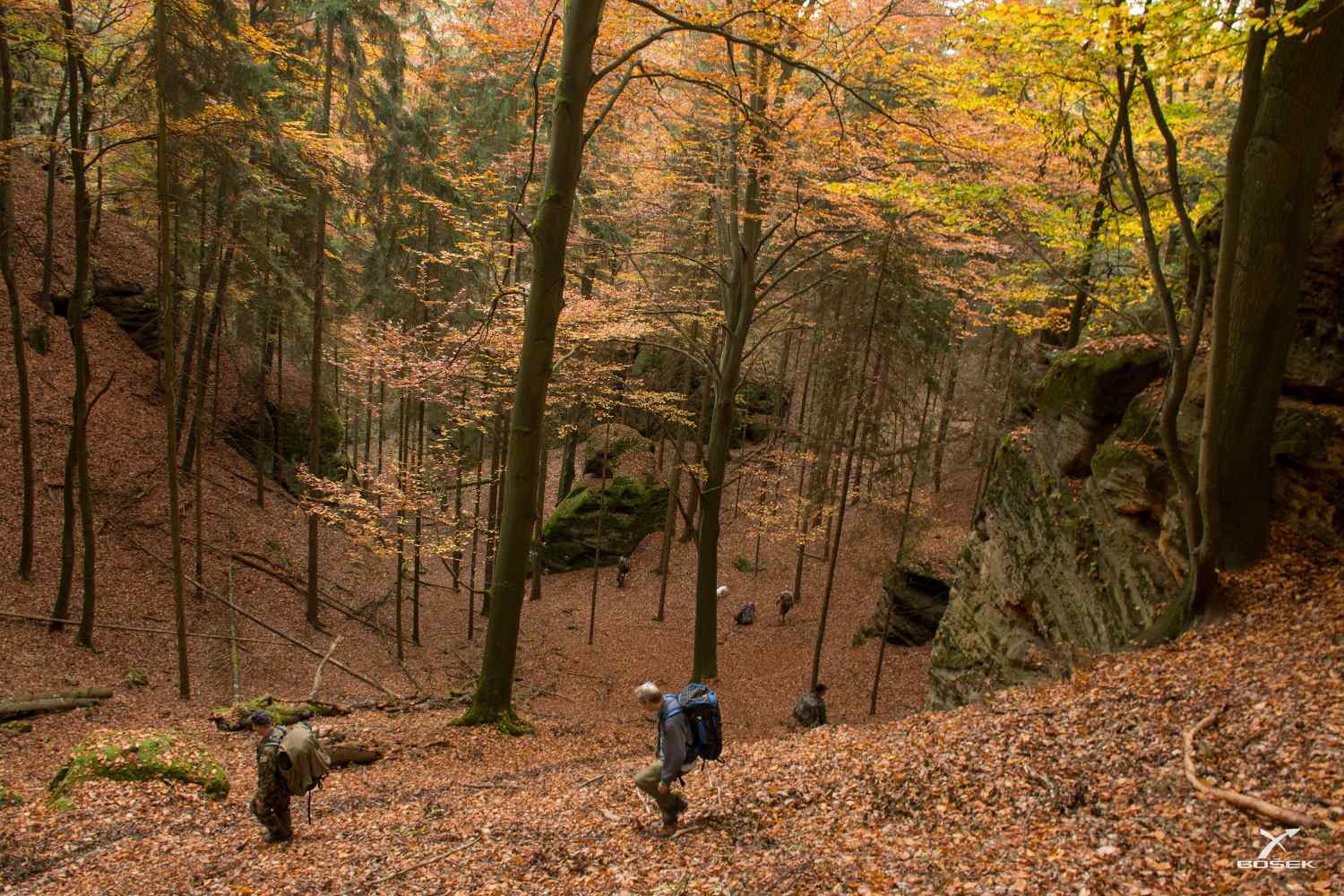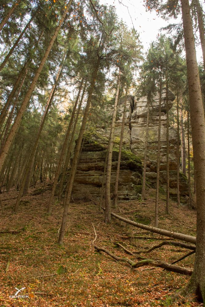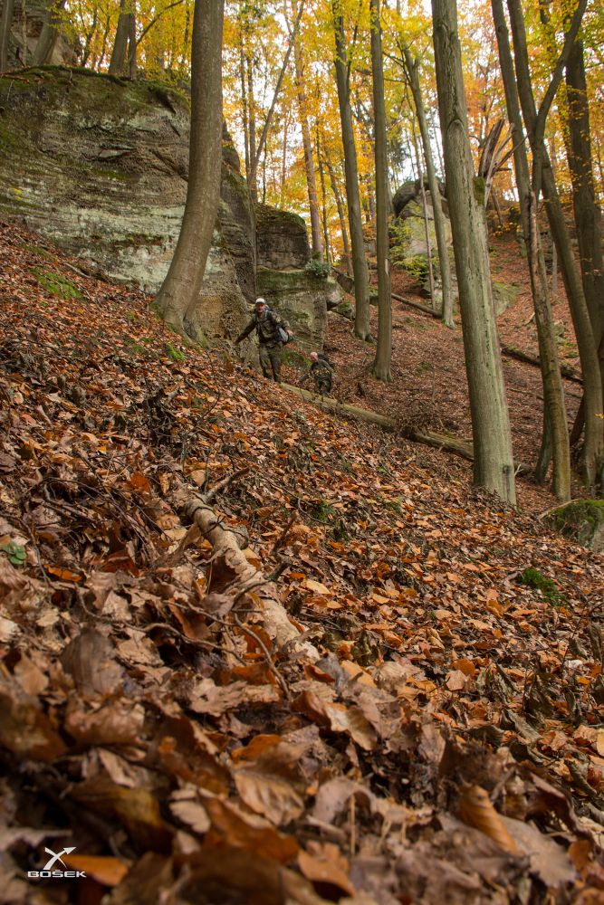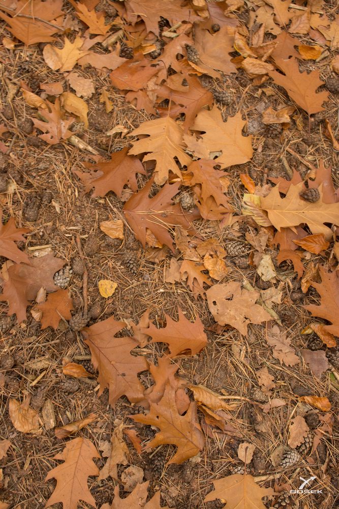 „Hele Bošku, kooukej doleva na ty skály,“ nabádá mě Simír k focení. „Zkusím to, ale skrz ten les asi nebude nic vidět.“ Nebylo a tak jsem si cvaknul pod nohama trošku abstrakce. Borové šišky a listy červeného dubu.