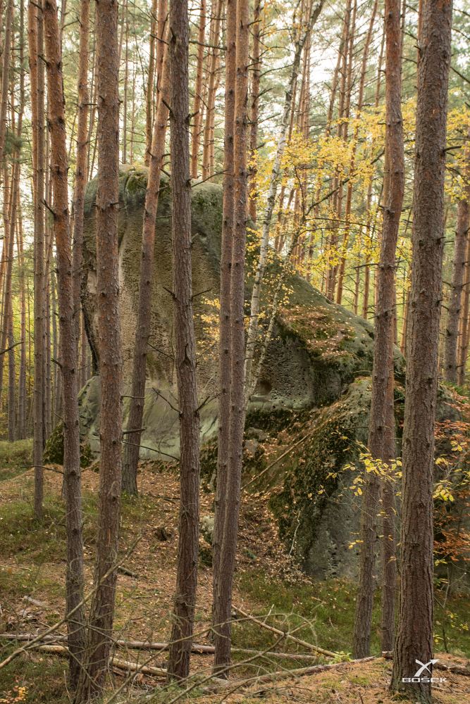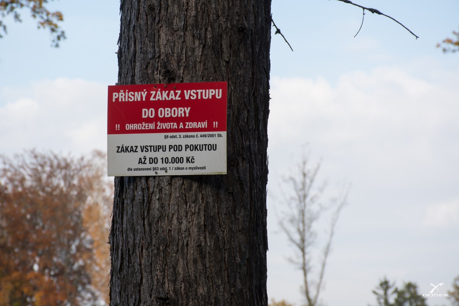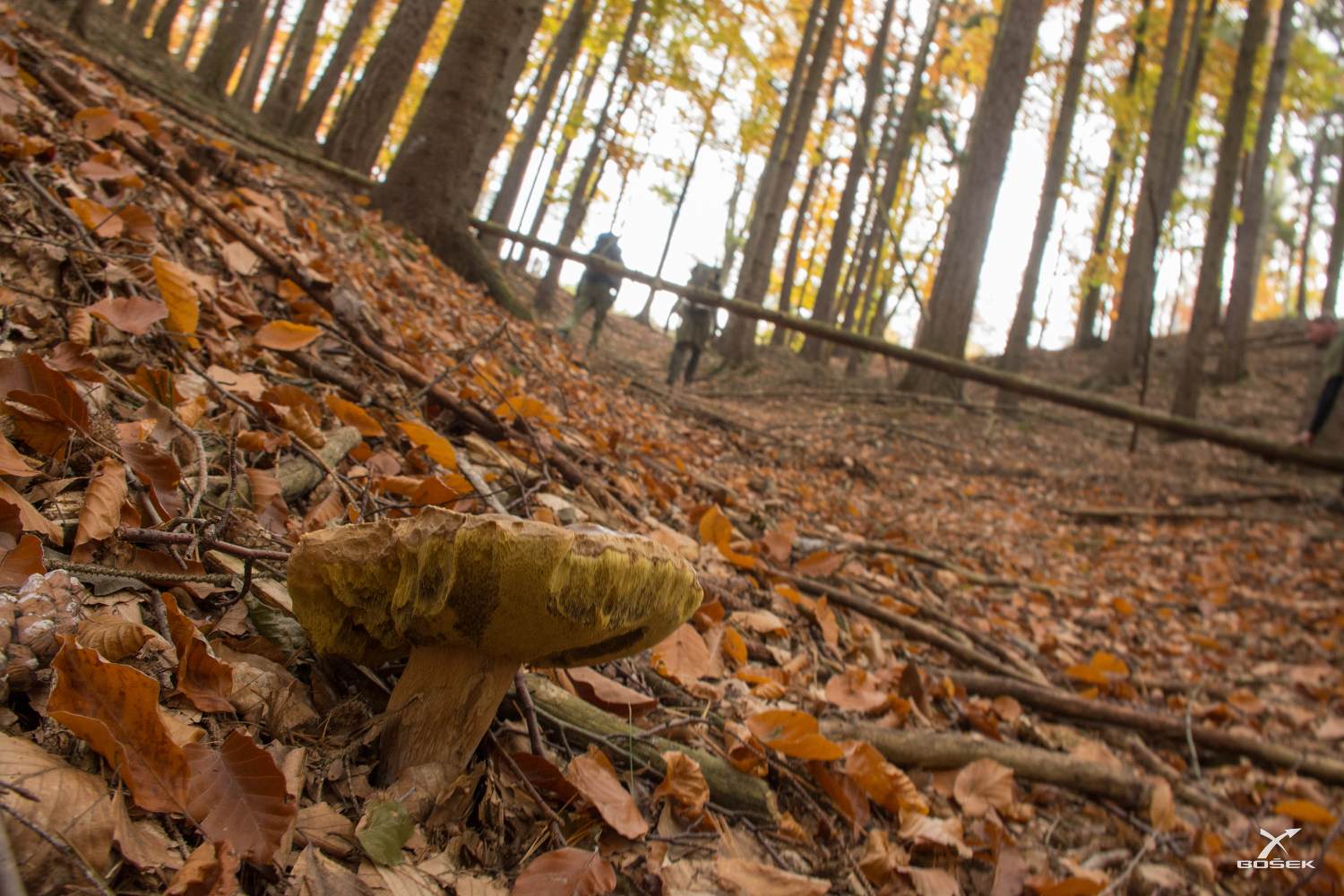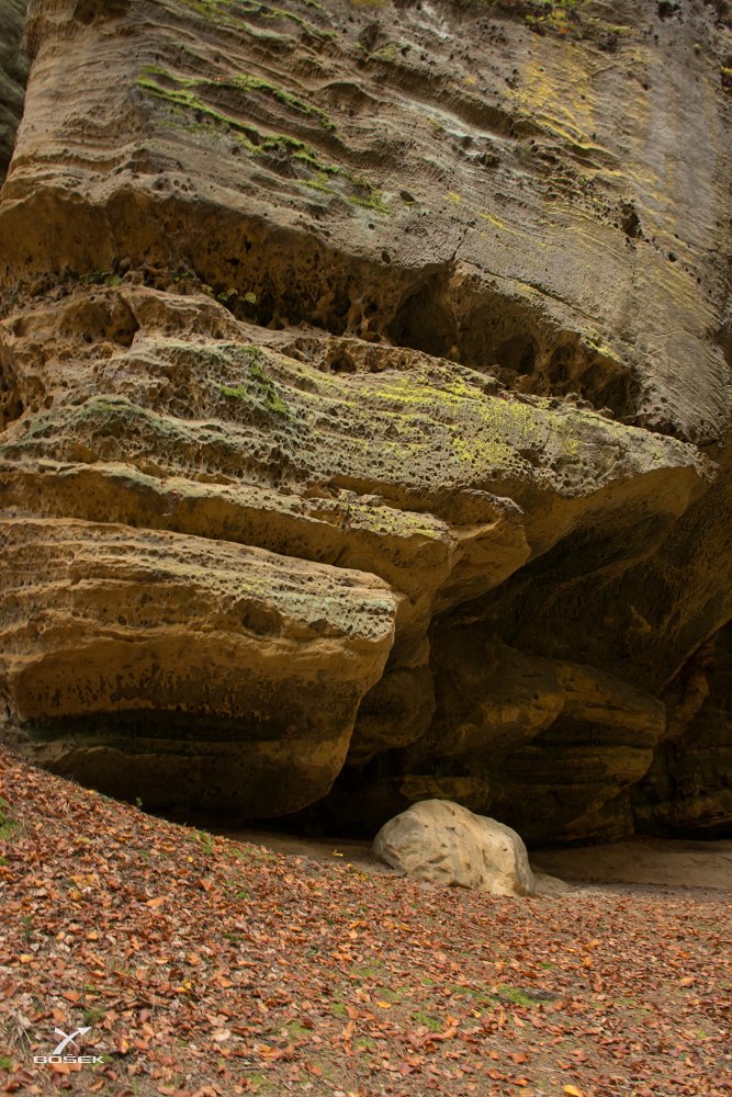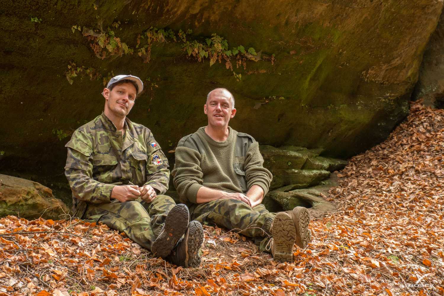 „Hele Bošku, kooukej doleva na ty skály,“ nabádá mě Simír k focení. „Zkusím to, ale skrz ten les asi nebude nic vidět.“ Nebylo a tak jsem si cvaknul pod nohama trošku abstrakce. Borové šišky a listy červeného dubu.