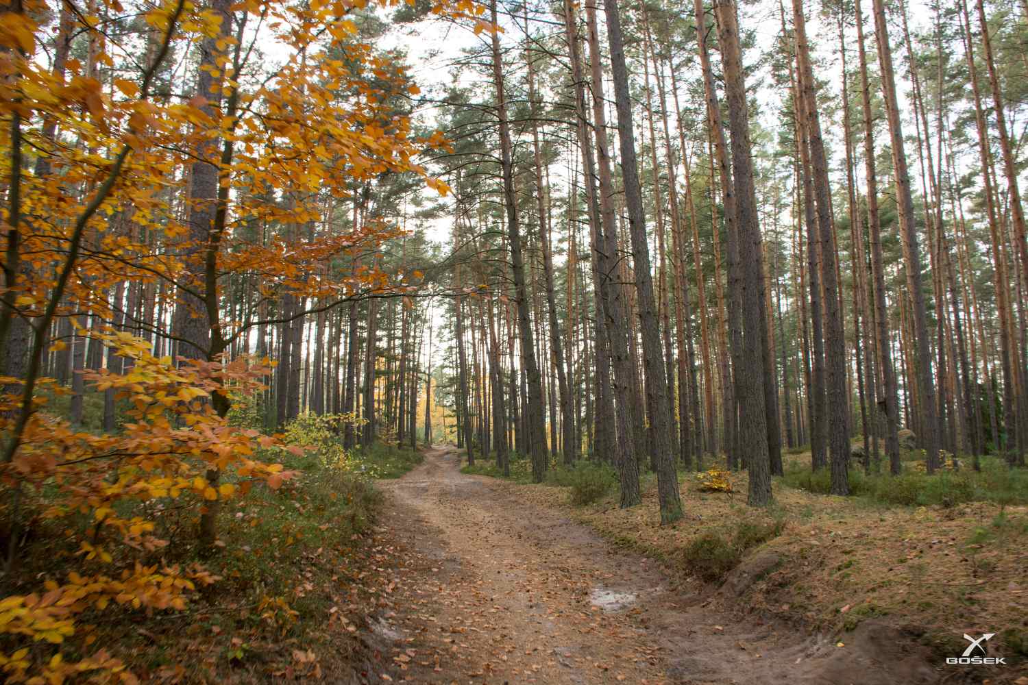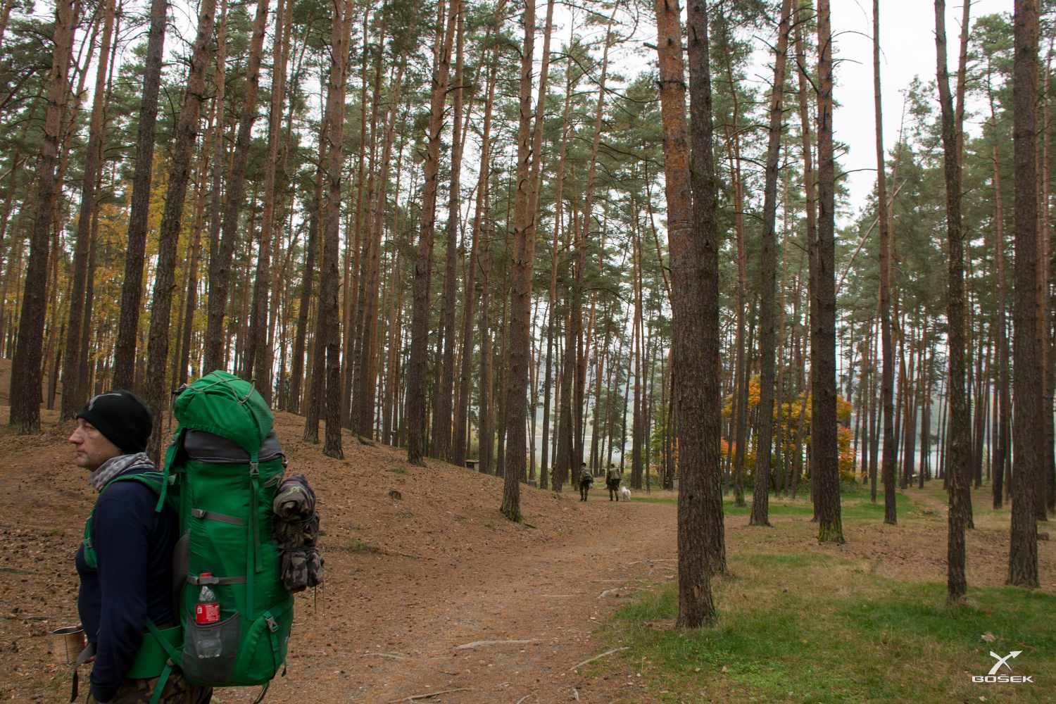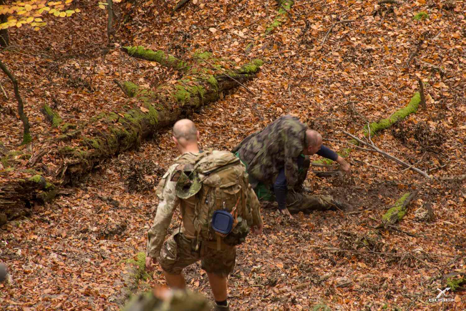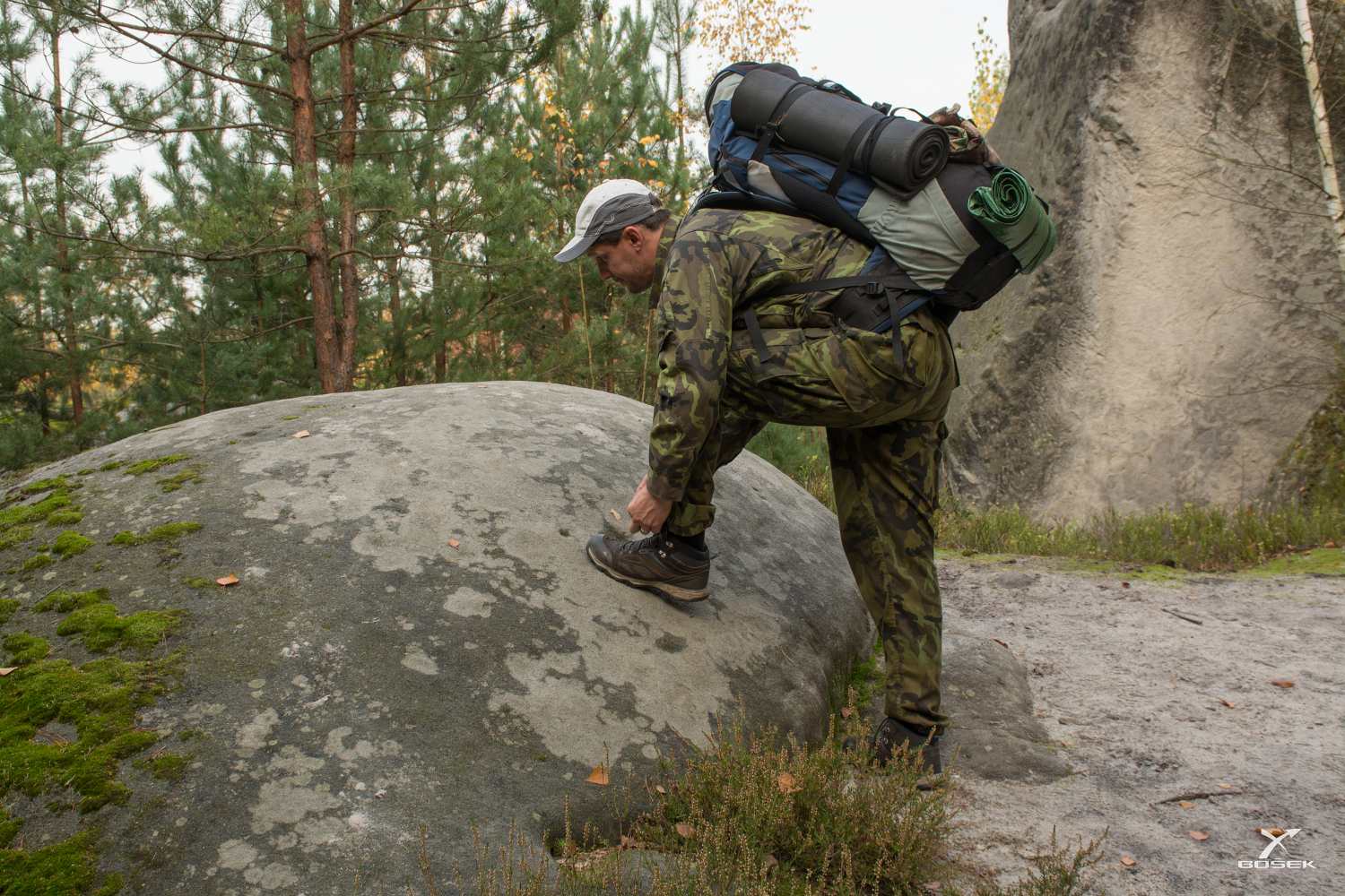 „Hele Bošku, kooukej doleva na ty skály,“ nabádá mě Simír k focení. „Zkusím to, ale skrz ten les asi nebude nic vidět.“ Nebylo a tak jsem si cvaknul pod nohama trošku abstrakce. Borové šišky a listy červeného dubu.