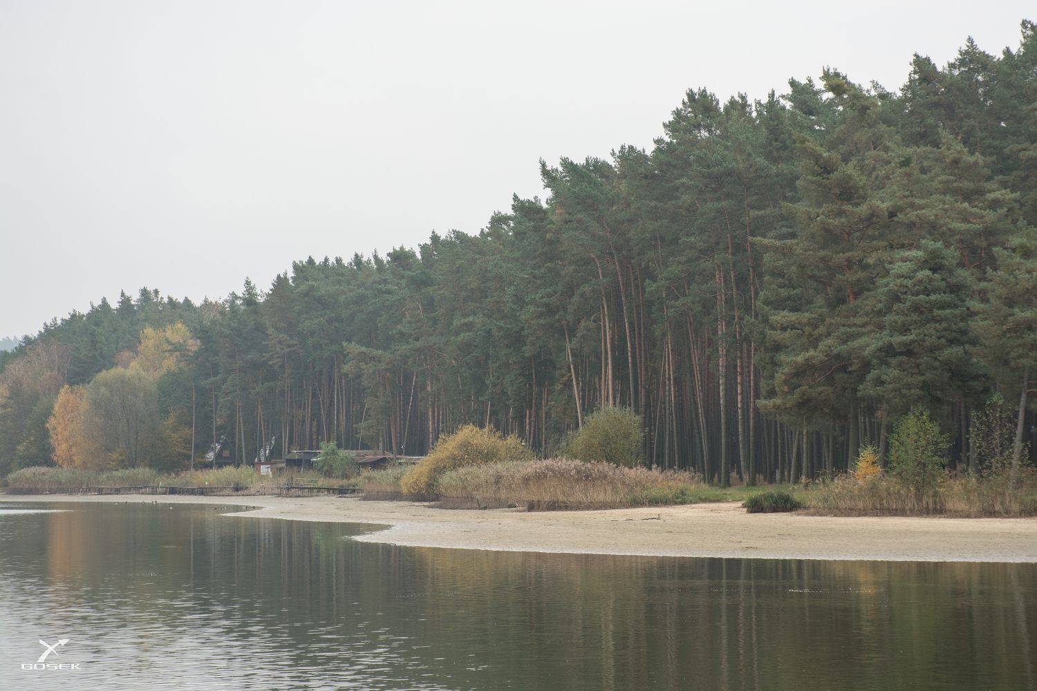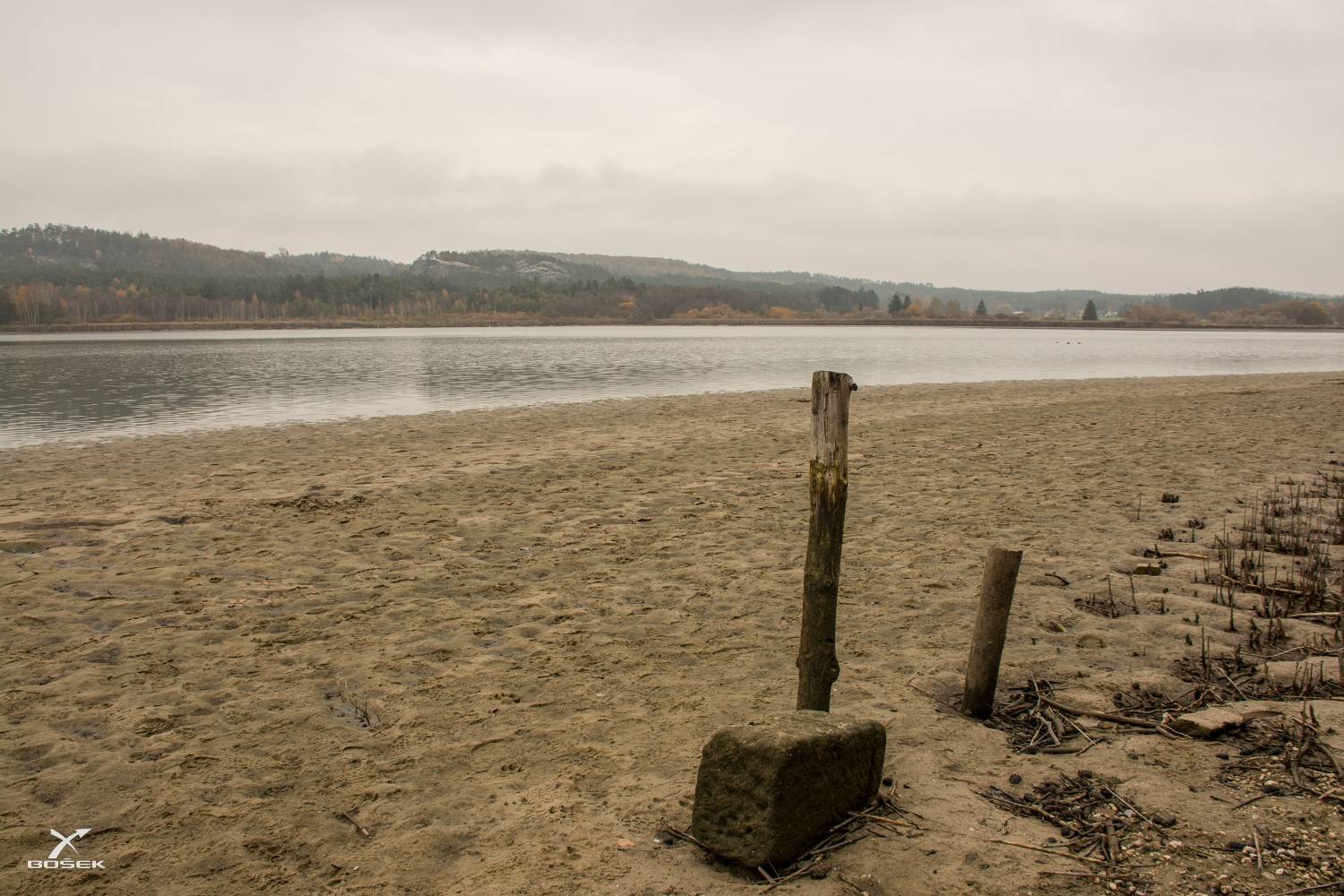 Ještě z hráze fotím pláž, kde jsme stáli před chvílí. Vzpomněl jsem si, jak jsme kdysi hloub v lese hráli proti jiný partě volejbal. Byla tu vždycky sranda, jako ostatně kdekoliv s klukama.