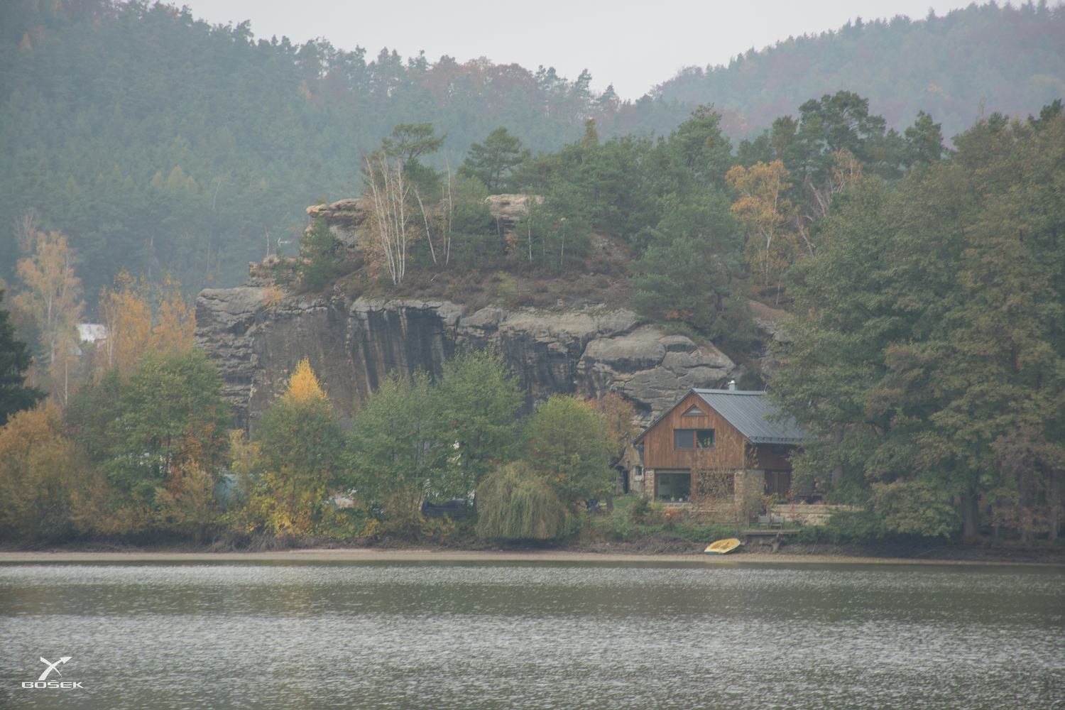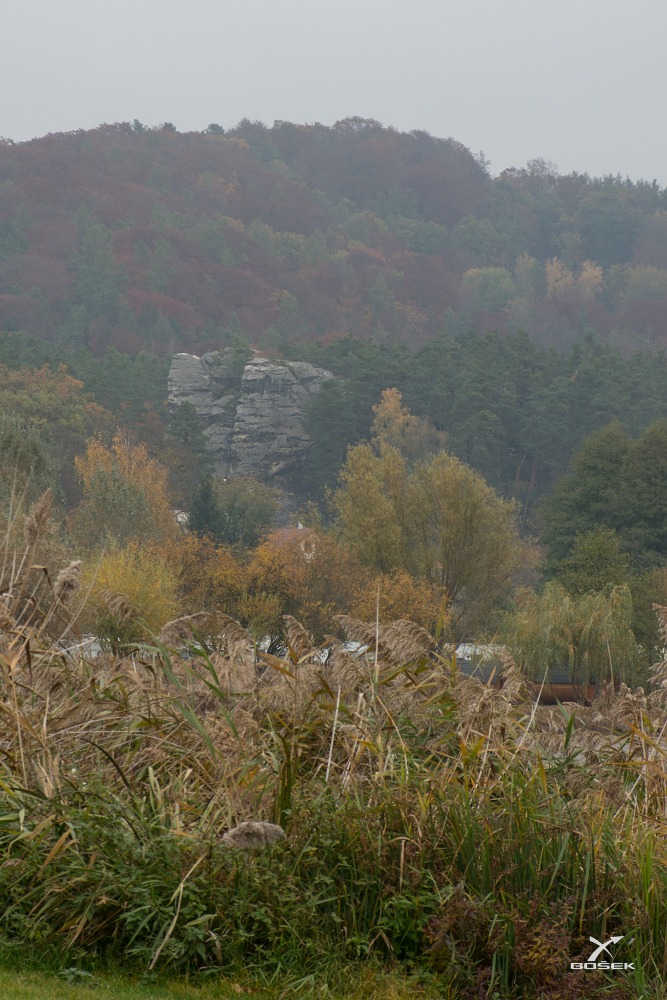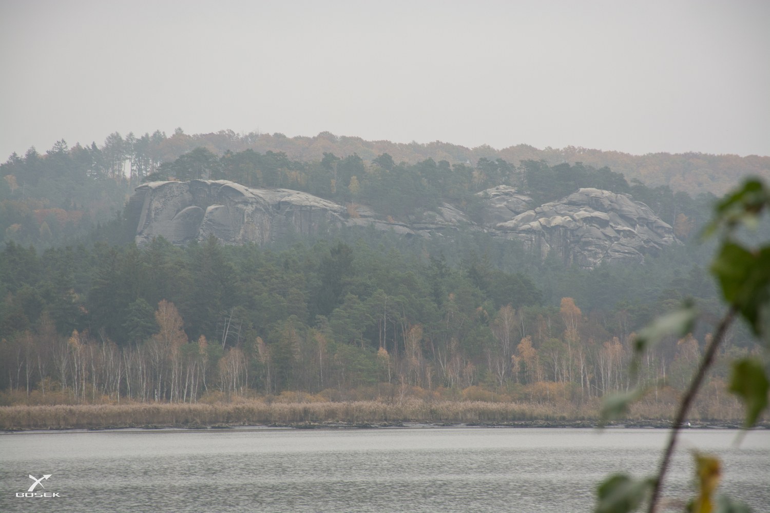Tohle na protějším břehu je Sokolka, 1. zóna (nejpřísněji chráněná) v CHKO Český ráj a je součástí Přírodní rezervace Příhrazské skály. Už jsem na vršku mockrát viděl stát lidi a přitom je tam zakázaný vstup kvůli hnízdění dravců, hlavně kriticky ohroženého Sokola stěhovavého.