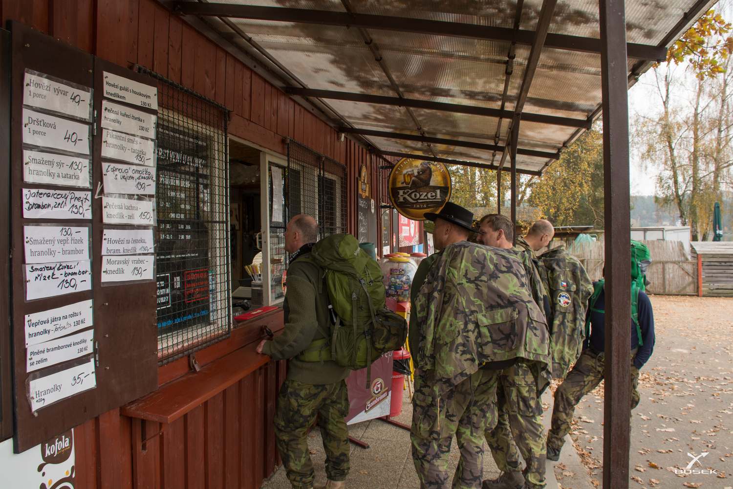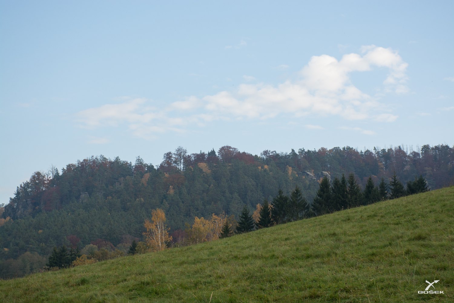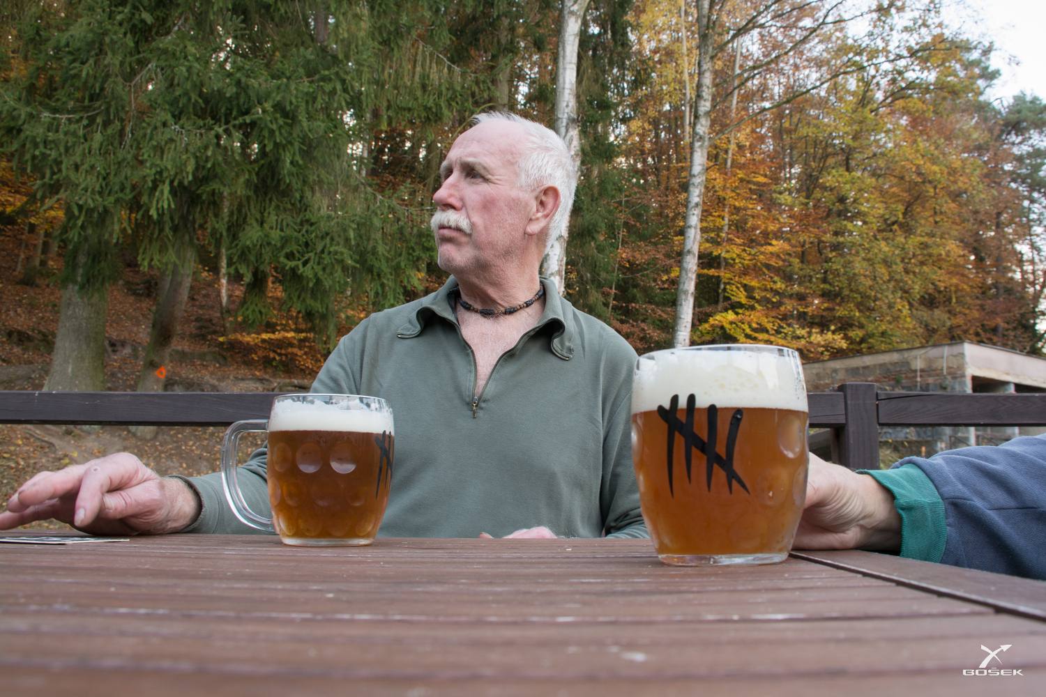 Z terasy hospůdky je krásný výhled na další skály. Chlapi kolem nás kmitají s akučkama a pomalu připravují hospodu na ukončení sezóny, máme fakt štěstí, že jsme je tu zastihli. Taky tu poznáváme tvář jednoho „bezďáka“, co se včera večer vymotal z hospody pod převisem a vyškrábal se k nám nahoru k ohništi zeptat, jestli nemáme pivo. Tady chlapům jako pomáhá: „Já teda pudu na ty houby, jo?“ zaslechnu jejich rozhovor. Takže asi ho tu jen trpí.