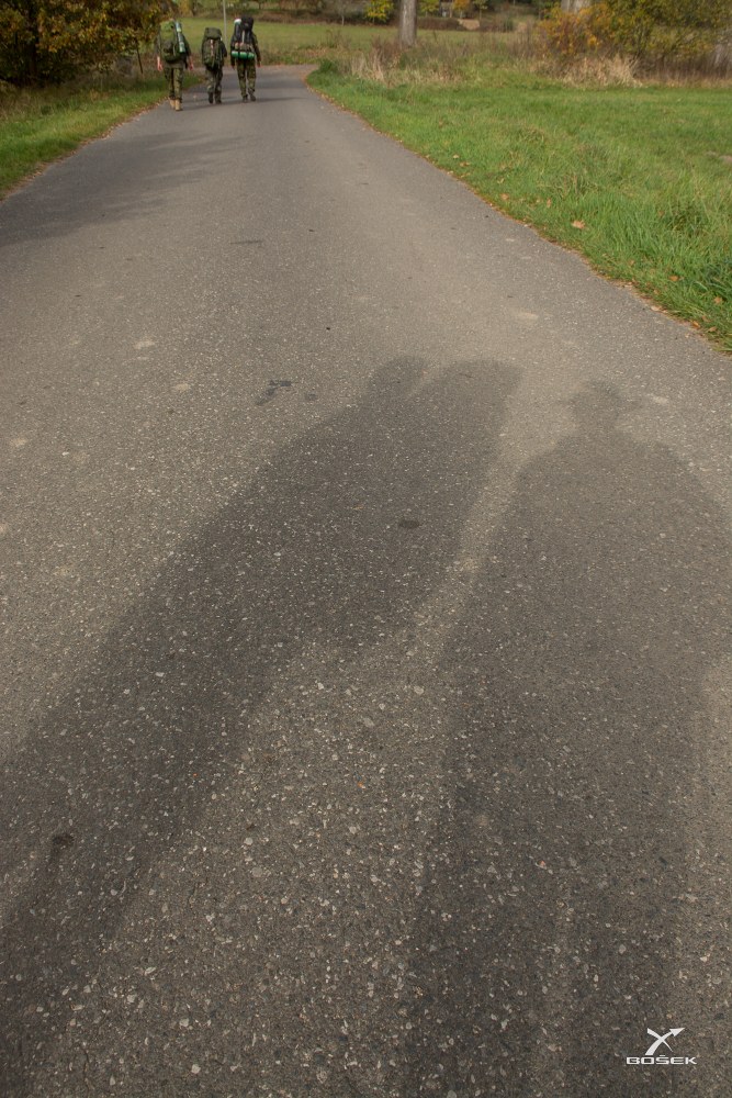 Nastal čas k odchodu. Už jen kousíček po asfaltu. „Hele zamávej, poprvý na tomhle čundru vidím náš stín,“ fotím jinak nic neříkající záběr.