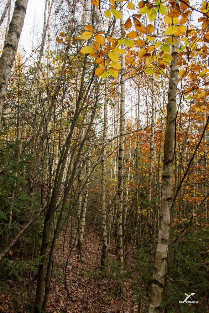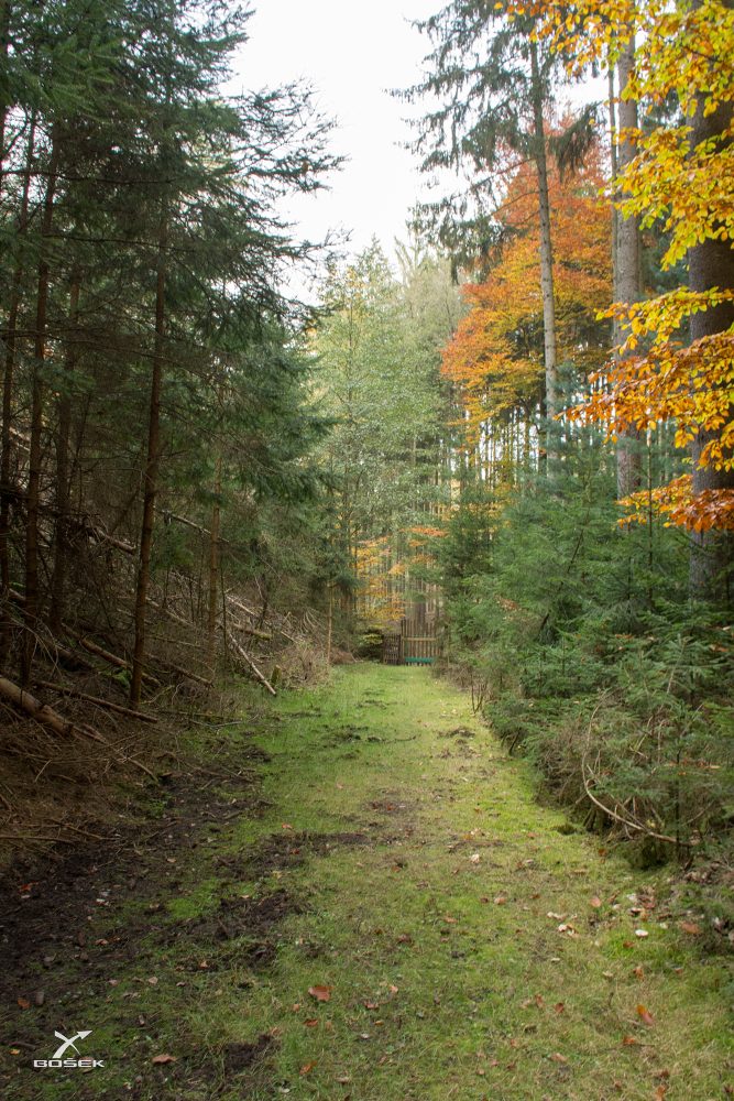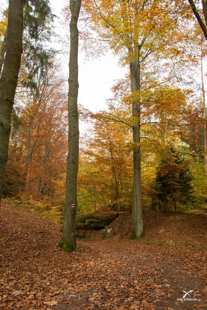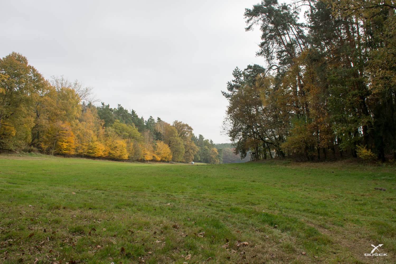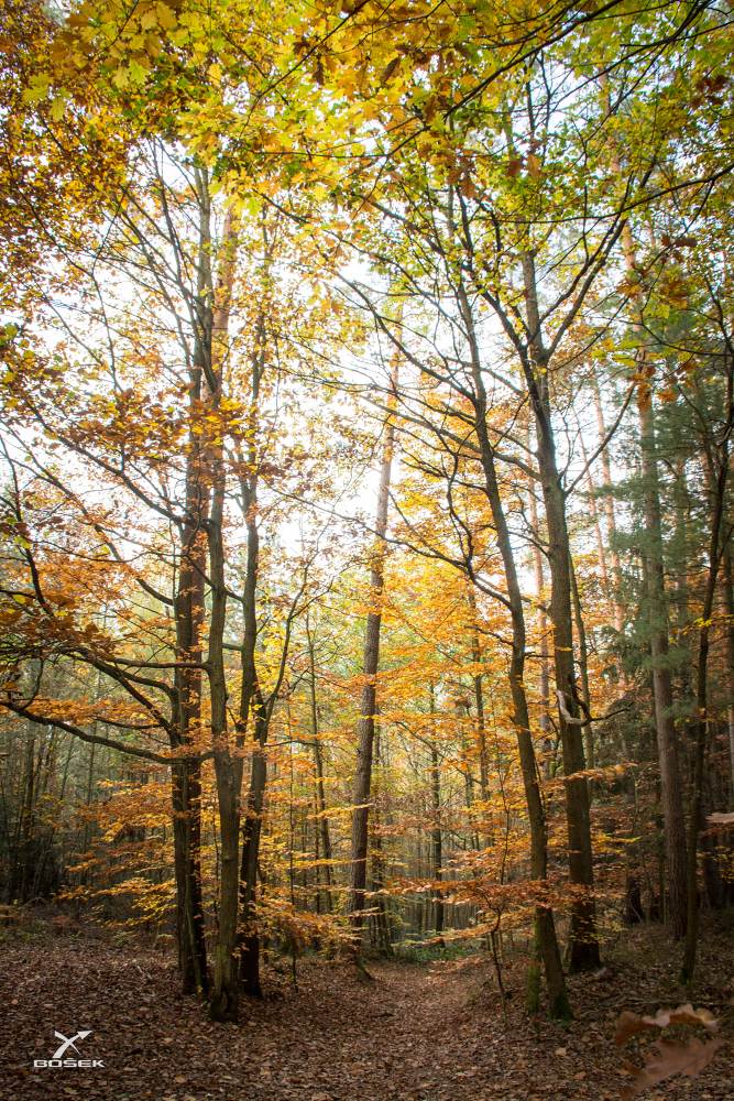 Po pár stech metrech ještě kopírujeme kraj louky, kde se otvírá opět krásnej výhled na zářící listnáče, ale pak už nás pohlcuje les.