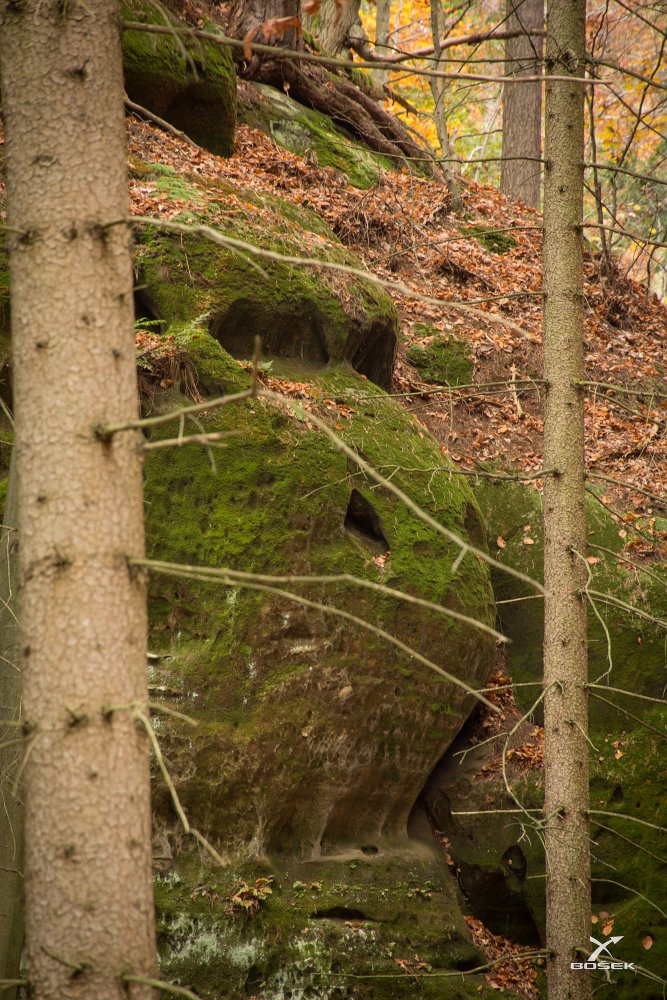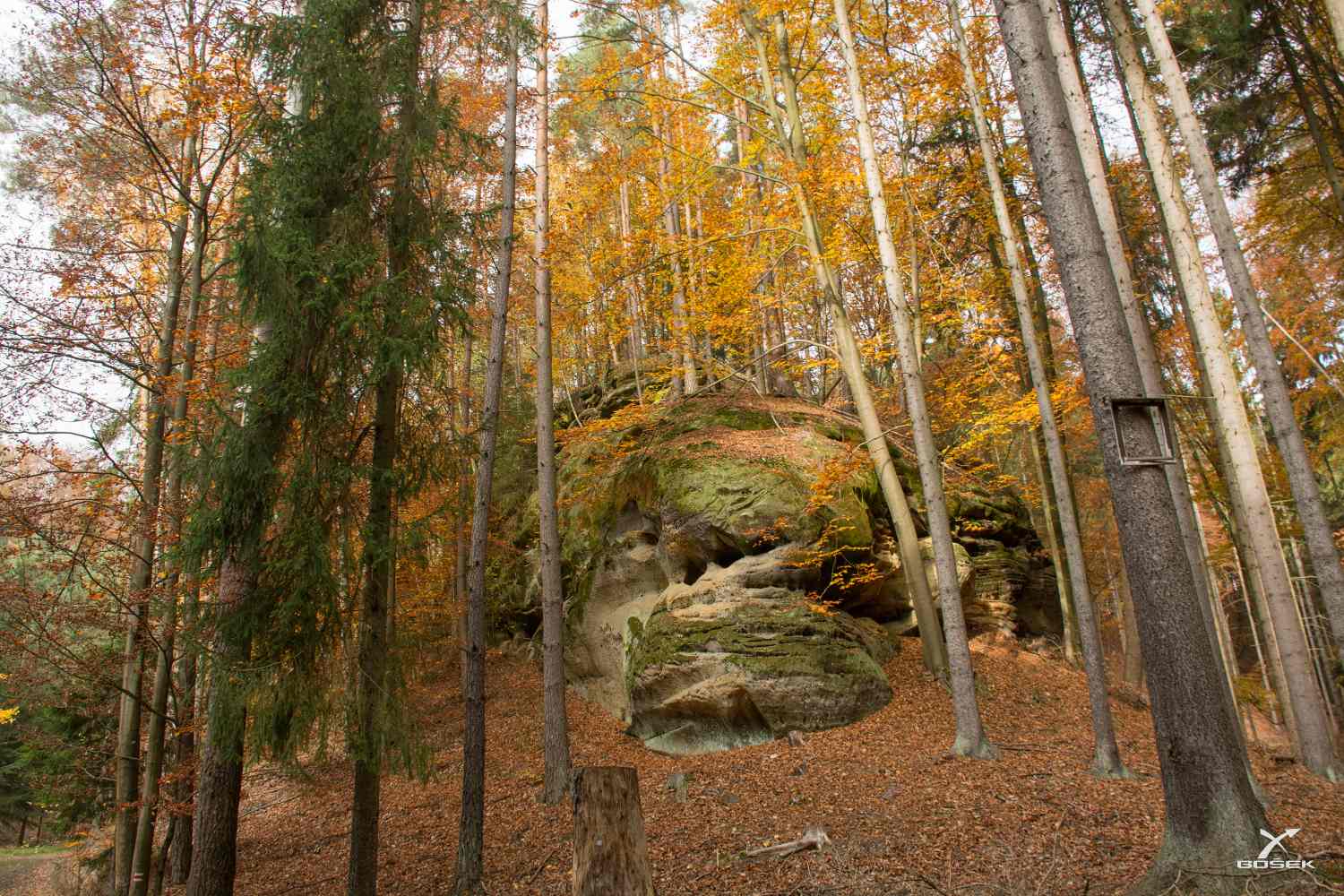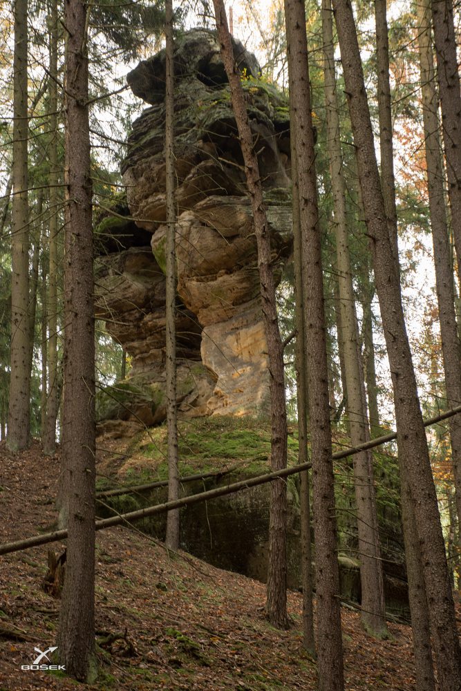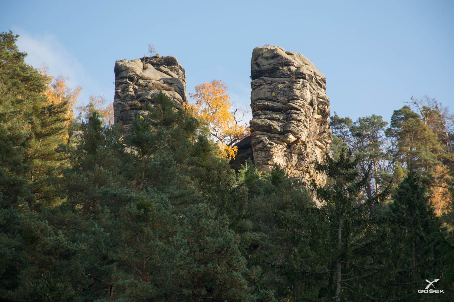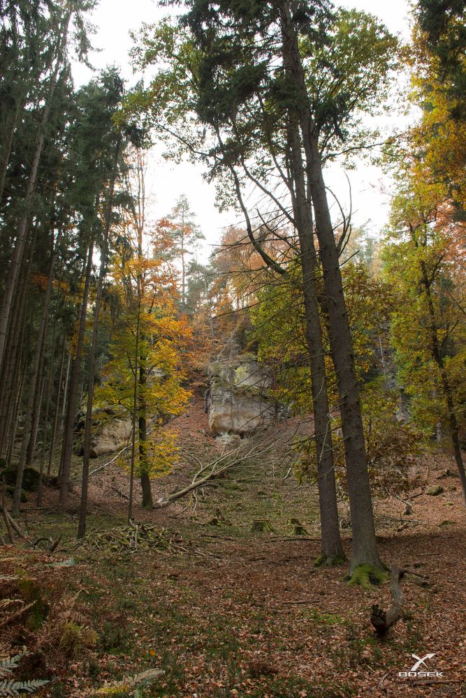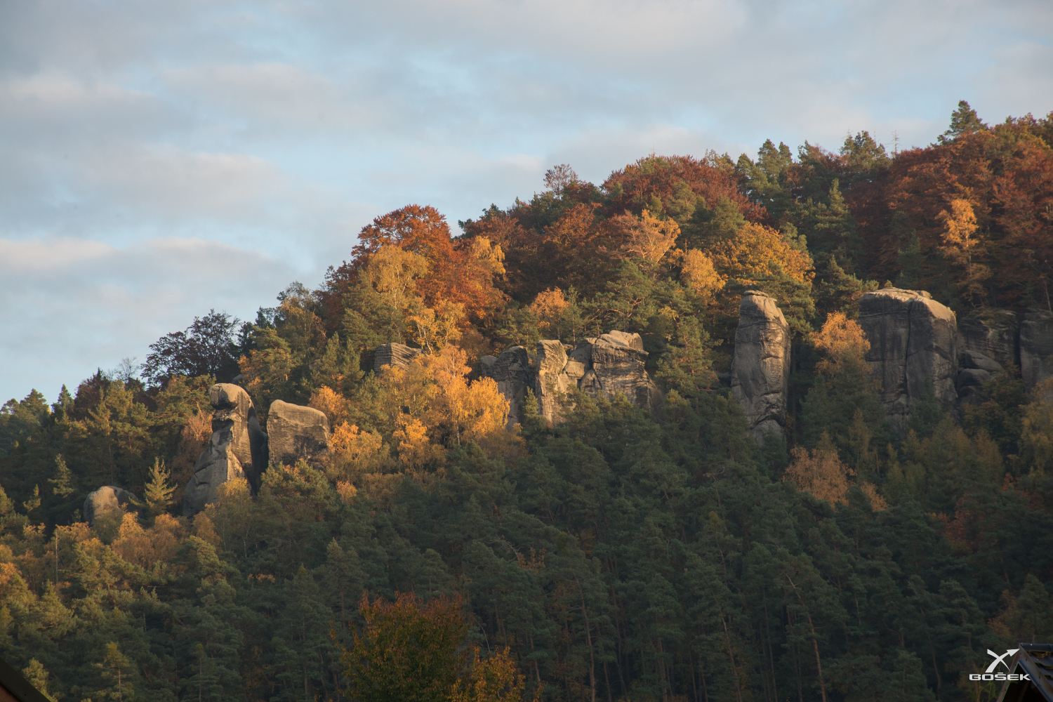 Už zase na chvilku vylezlo sluníčko a já si naposledy fotím osvícené špičky stromů i skal, tentokrát jsou to nejsevernější věže Příhrazských skal.