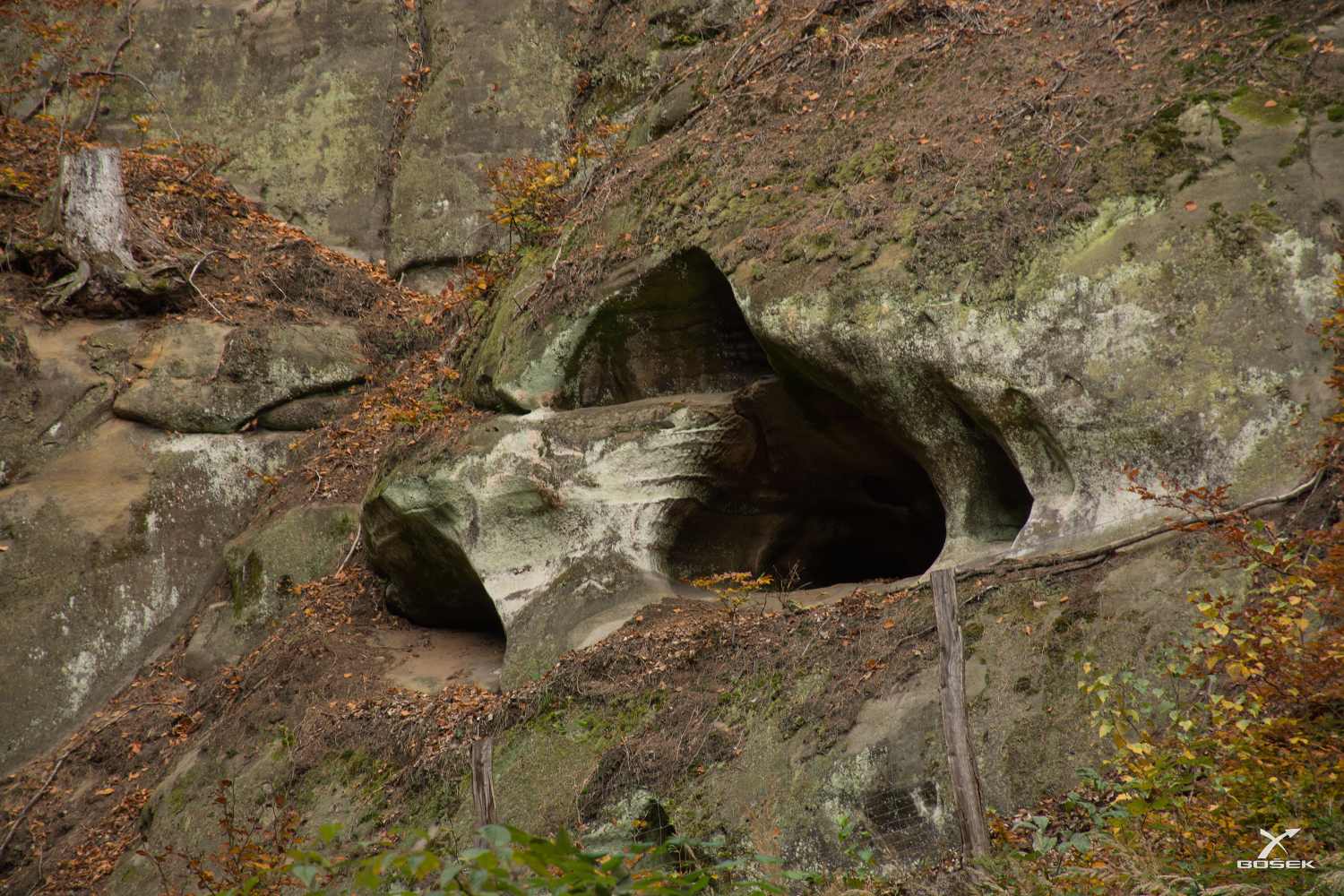 Cestou pořád zkoumáme díry, převisy i jeskyně. „Jak je to velíký?“ „No, jeden by se tady celkem slušně vyspal, je to tu i rovný.“