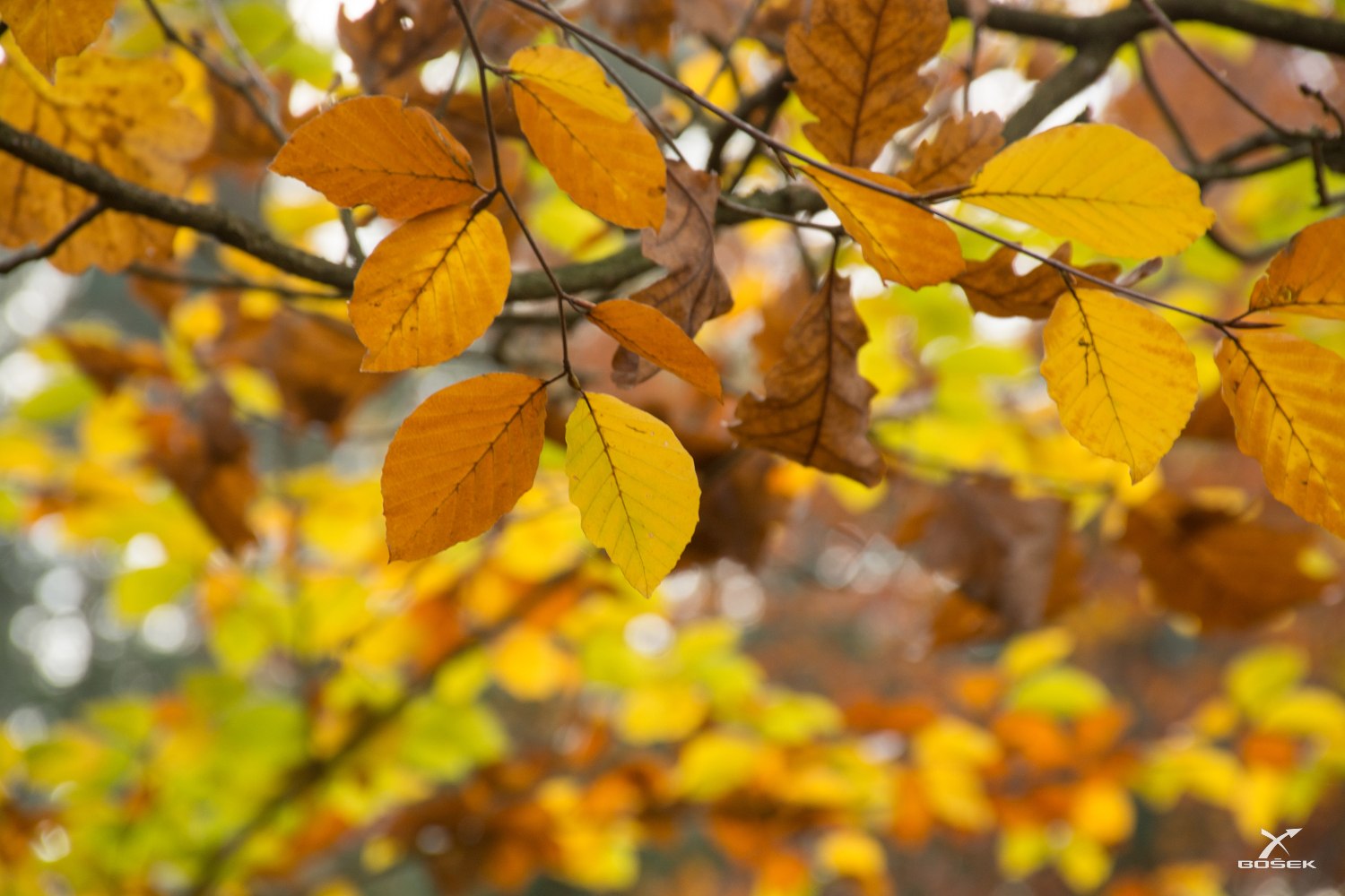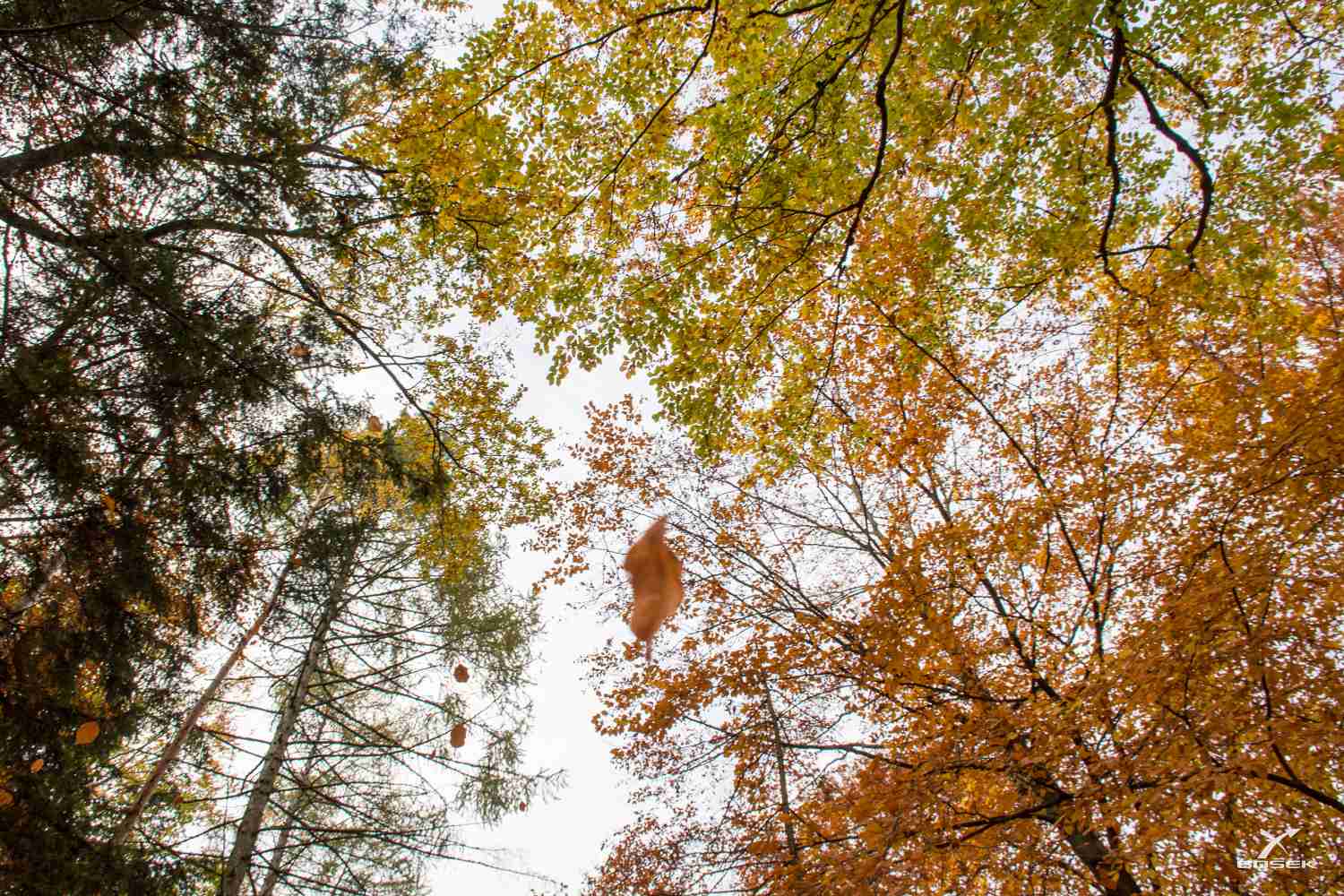 Zafoukal vítr a na nás se sype z buků zlaté listí. Zkusil jsem to vyfotit, ale moc dobře mi to nejde.