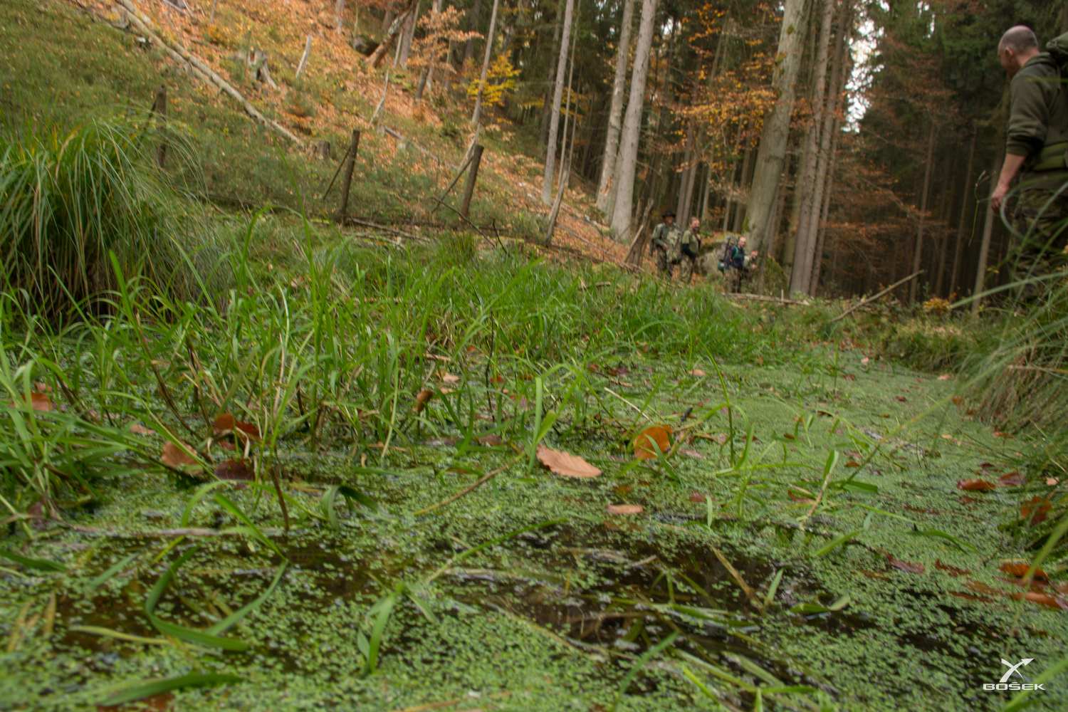 Konečně rovina. Ještě překonat lesní tůni. Nejlíp obejít po nejistý pěšině. Nejdřív jsem uvažoval, že ji přeskočím, ale s batohem se blbě skáče.