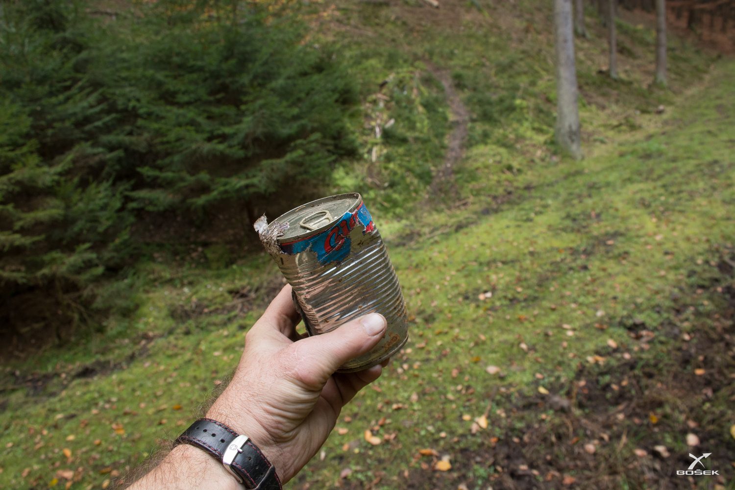 Vracím se z potulky a u cesty jsem našel normálně plnou plechovku. Odhaduju, od čeho asi je. První nápad byl, že nějaký mandarinkový kompot. Ale co tady v lese dělá? No, tahat to v ruce nebudu, strčím to do báglu a kluků se pak zeptám, až je doženu.
