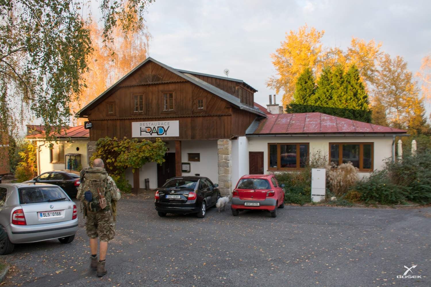 Sem nevede, byla to odbočka z hlavní trasy. Těšili jsme se v Olšině v hospodě Pod Hrady na pivko, případně na polívku a mají bohužel zavřeno. Chvíli sedíme na lavičce venku a zvažujeme, co dál. Nám s Vlastíkem to jede za hodinu, tak se rozhodujeme, že vyrazíme na vlak. Ostatním klukům to jede až za dvě, a tak si jdou sednout na terasu za hospodu, kde je závětří.