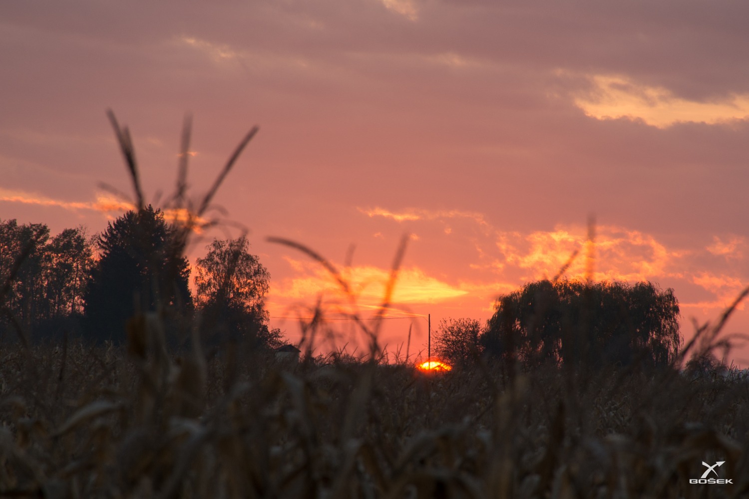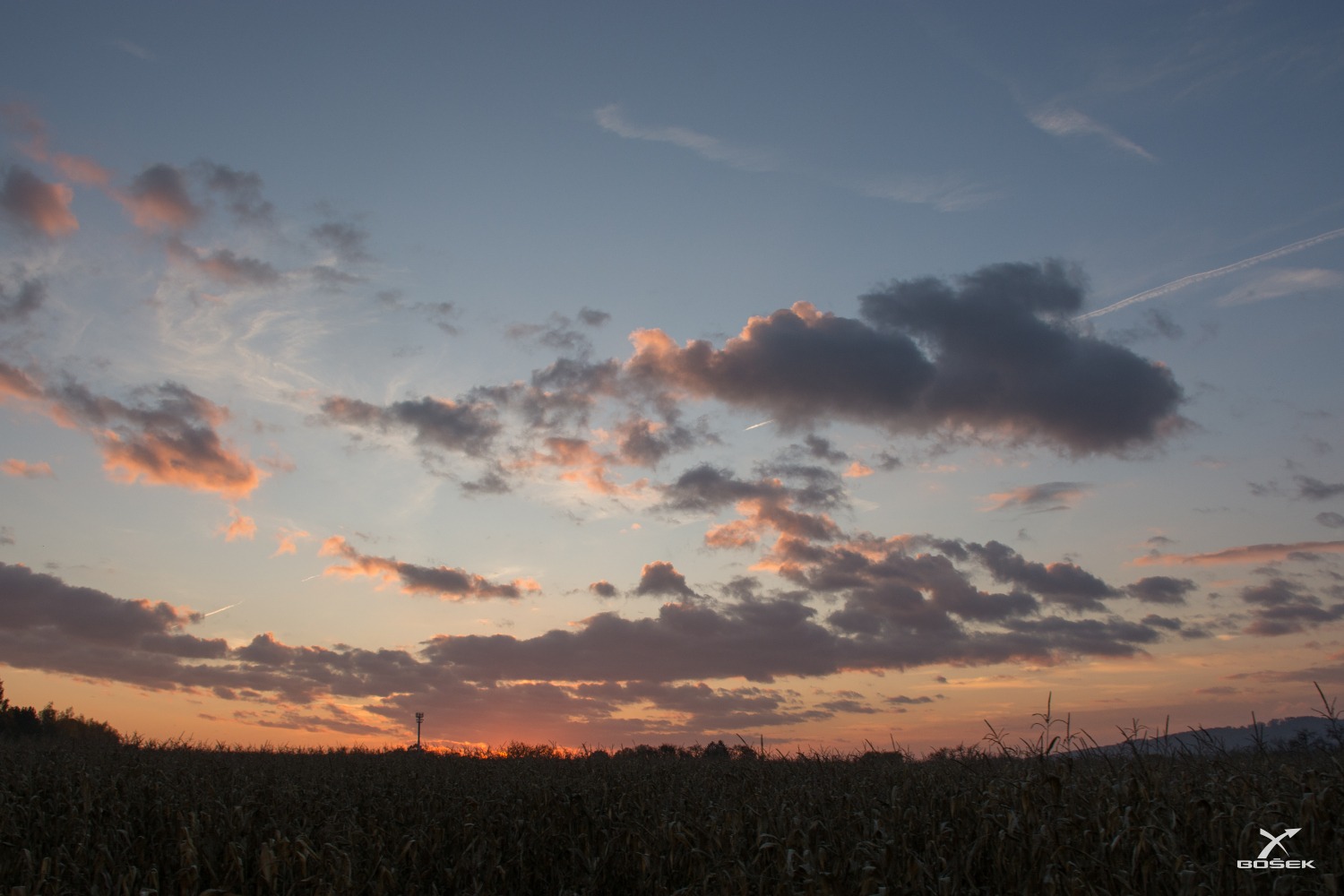 Mraky hrajou na obloze kouzelný divadlo. Sluníčko už asi neuvidím, brání mi v tom kukuřičný pole.