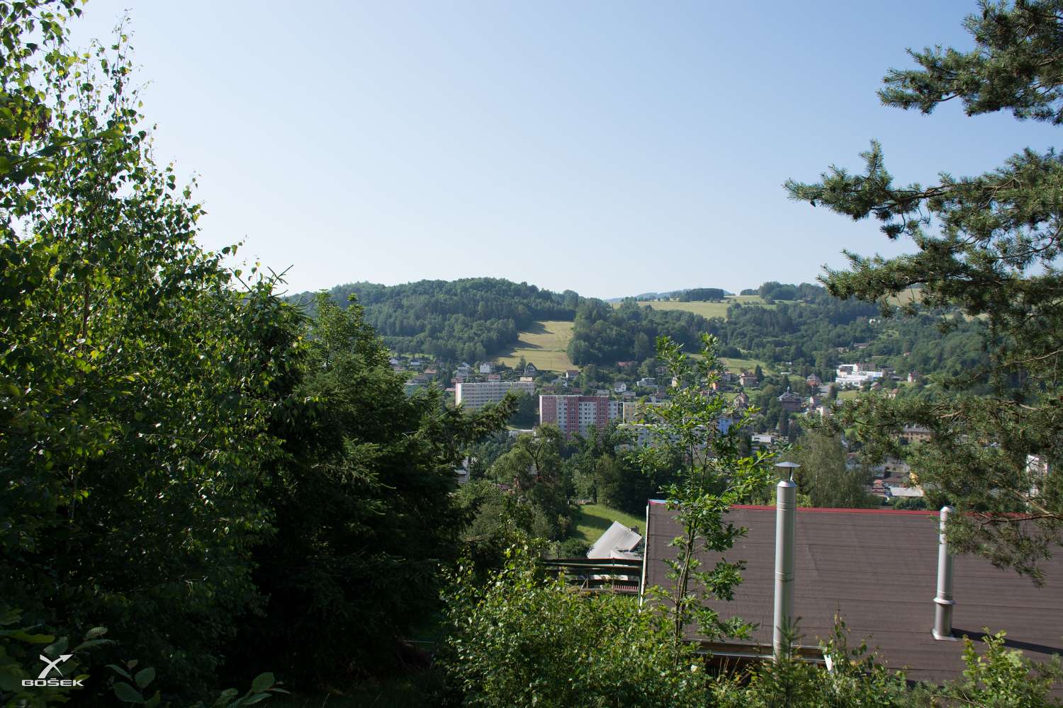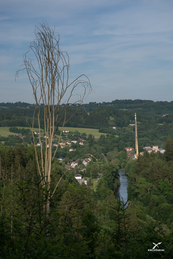 Sem tam se nám otevírá pohled na Semily, třeba tenhle s uschlým samotářem, Jizerou a komínem.