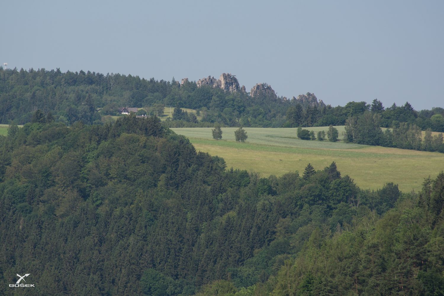 Stoupáme dál a už vidíme i trochu víc kopečků vpravo než předtím, když se otočíme. Proti horizontu se tam tyčí Suché skály. Tam jsem už byl dvakrát, jednou s Boldrikem na mašině a jednou s rodinou, ale nikdy jsem tam nelezl. Někdo Suškám prý říká české Dolomity. Dřív se jim taky říkalo Kantorovy varhany. Trošku jsem si je objektivem přitáhnul, jsou odsud čtyři kiláky vzdušnou čarou.