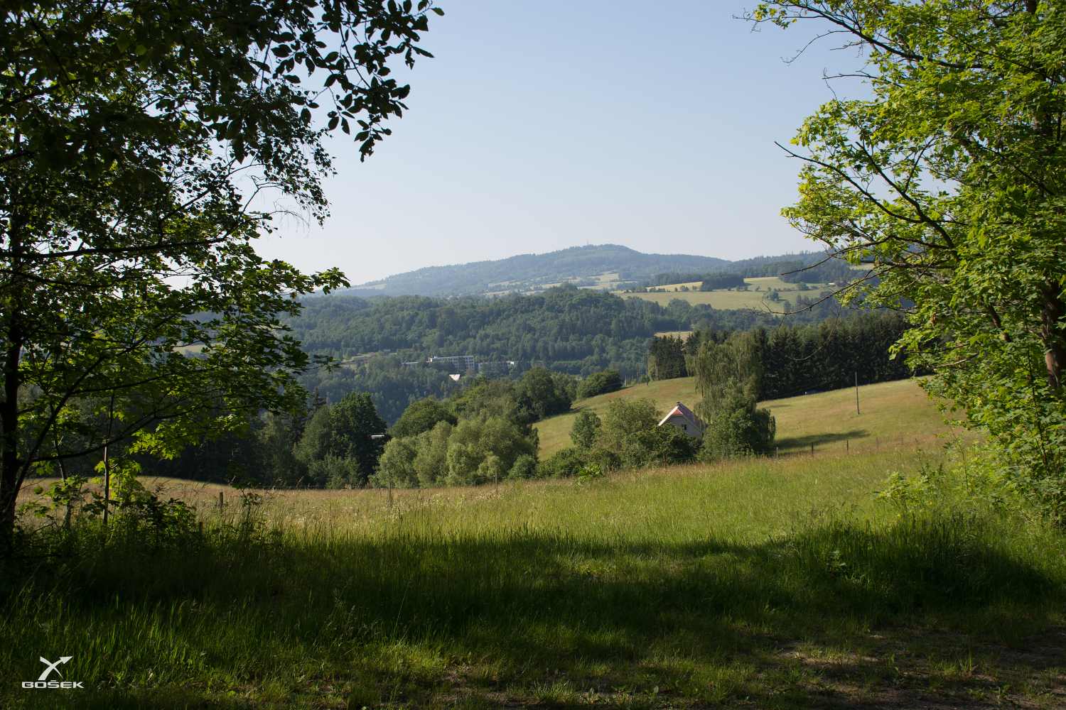 Drápeme se do kopce (jak jinak, že?) a už vidíme protilehlé kopečky. Jeden má jméno Dlouhý vrch, zbytek je bez jména. Vzadu se dá spíš jen tušit Hamštejnský vrch s rozhlednou.