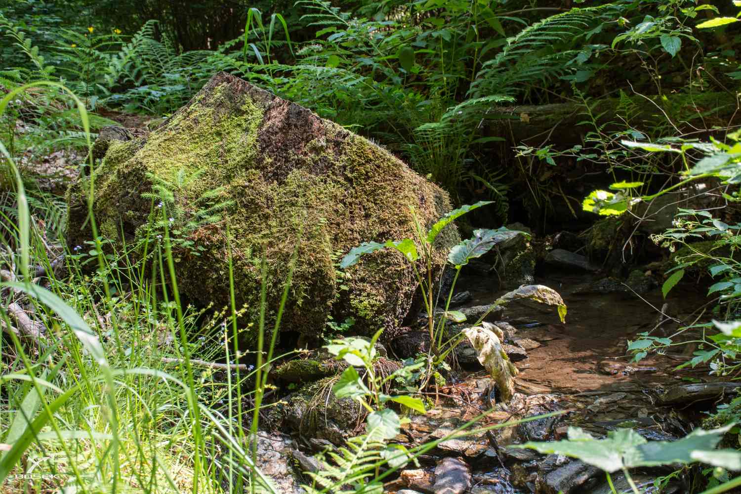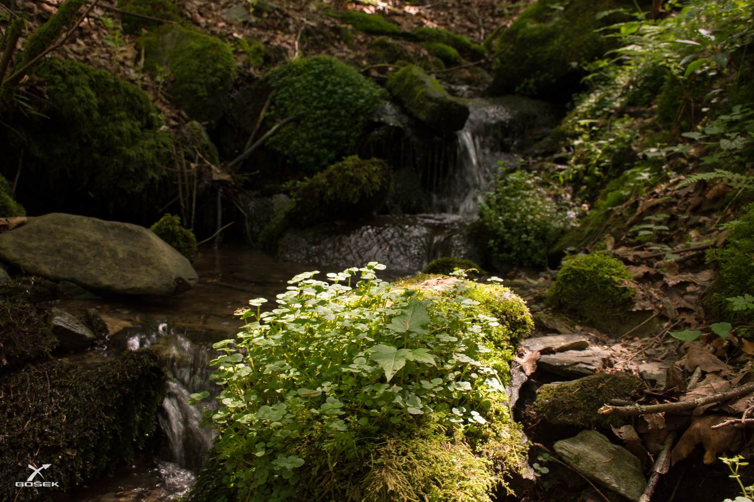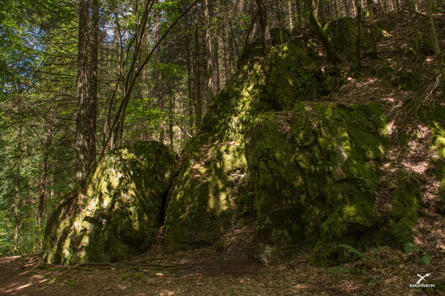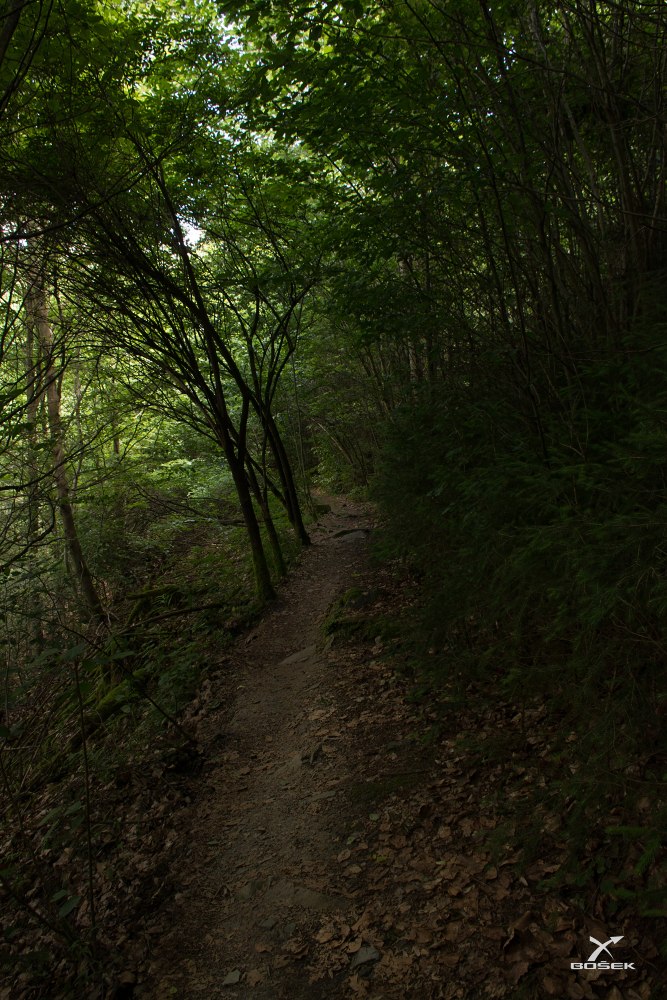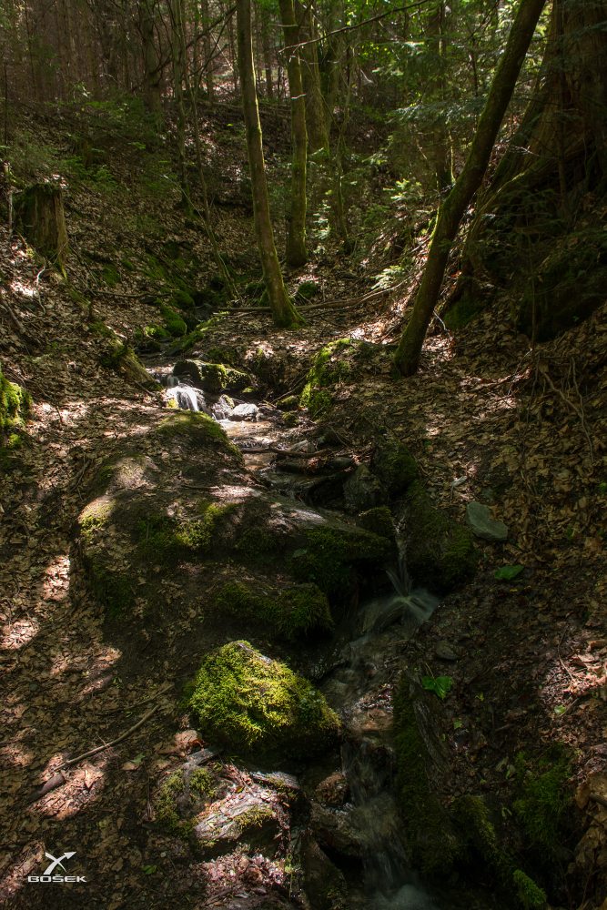 A další potok nám kříží cestu asi po půl kilometru. Ten taky pramení kousek pod Bozkovem, ale teče jiným údolím, jinou roklí. Slunce hraje se stíny tak kontrastní hru, že je to těžké rozeznat na vlastní oči, natož pak na fotce.