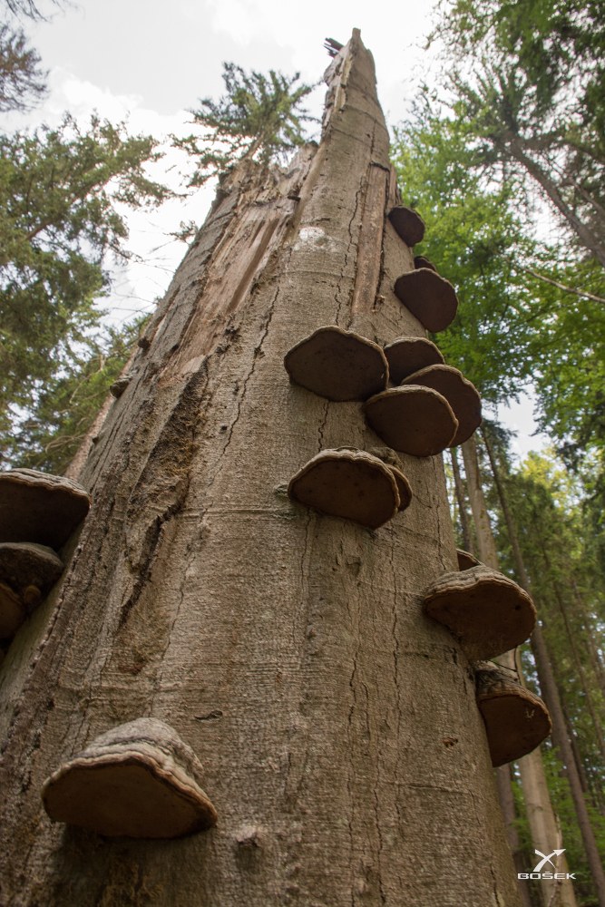 Takových nemocných starých buků je tu celkem dost a některý dost nepříjemně svou spadlou korunou či kmenem zatarasily turistickou stezku.