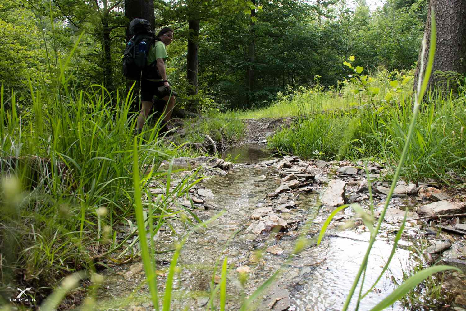 Pěšina několikrát kříží Střevelnou tam a zpět, a tak je o srandu s broděním a přeskakováním z kamene na kámen o legraci postaráno.
