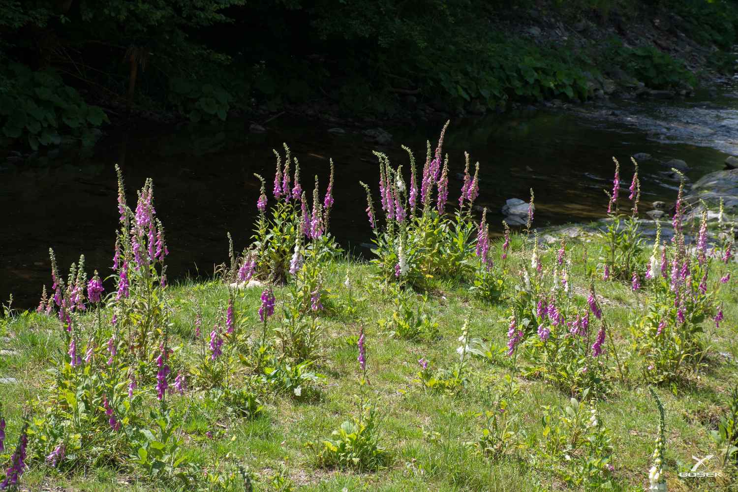 Pod lávkou přes Kamenici začíná ostrov a ten je posetý krásnými náprstníky. Líbil se mi ten kontrast ostrova zalitého sluncem se stinným břehem řeky. Pode mnou, odkud fotím, je vybudovaný náhon k bohuňovské elektrárně.