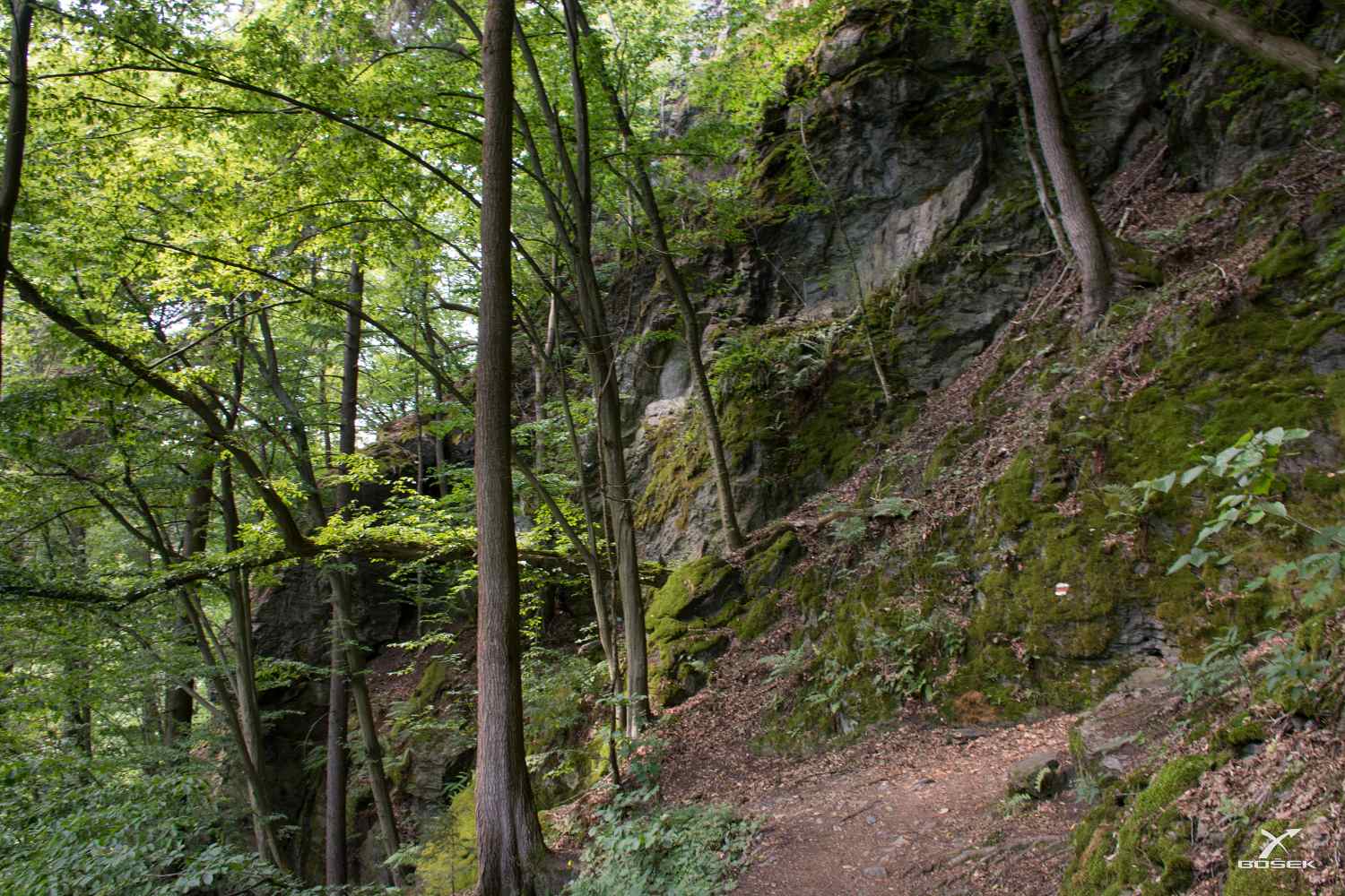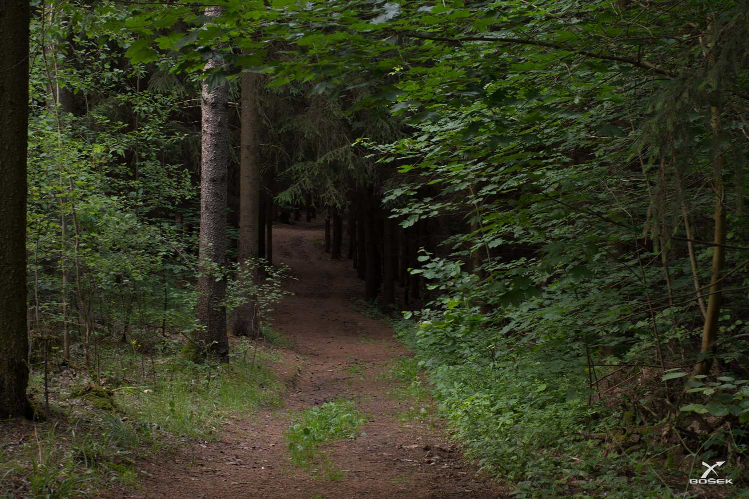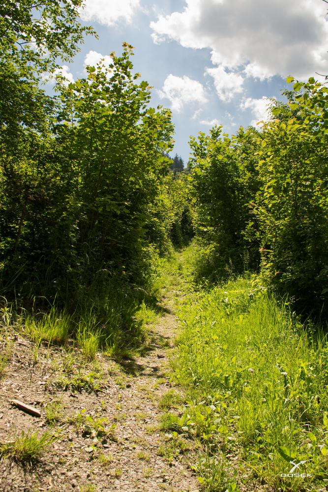 Najednou je tma. Přišli jsme na stezku probíhající skrz mladé listnaté keře a stromy s hustými korunami a slunce v tu chvíli navíc zalezlo za mrak.