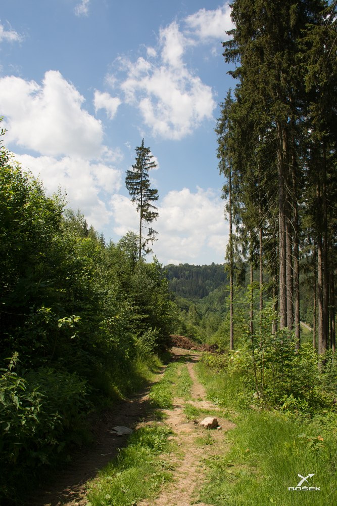 Prošli jsme obcí Střevelná a stoupáme pořád dál. Za chvíli budeme už naštěstí klesat.