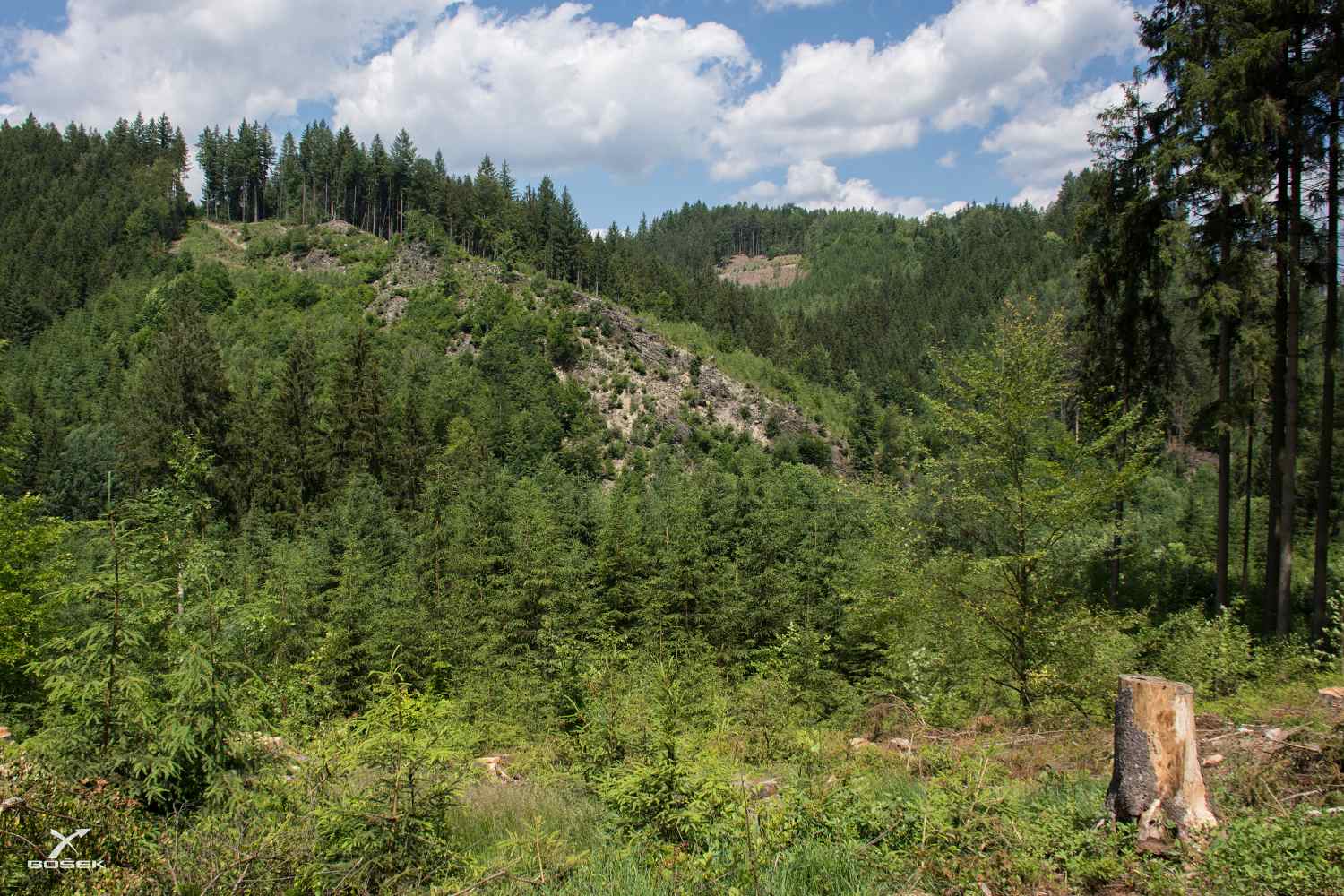 Došli jsme až na mýtinu. Otvírá se nám pohled na protější dvě stě metrů vysoké stráně. „Vpravo na té mýtině je snad silnice, ne?“ „Jo“, říká Janča: „Nevím, jak je to dlouho, ale vedla tamtudy objížďka, když dole opravovali silnici.“