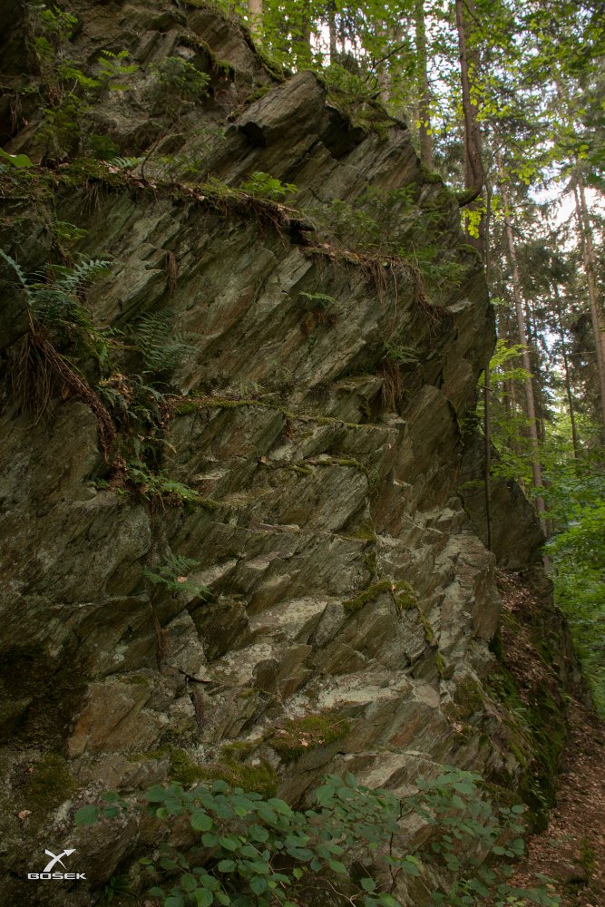 První skály z blízka. Hodně mi připomínají Hnědé skály u Strážného v Krkonoších. Na těch jsem kdysi v pravěku lezl. Mají podobnou strukturu, ostré hroty a hrany, vrstvy horniny míří šikmo vzhůru. Akorát myslím, že ve Strážném nebylo tolik mechu. Janča to na Hnědých skalách taky zná a taky tam v minulosti zkoušela lézt. A taky se jí ta struktura moc nezamlouvala.