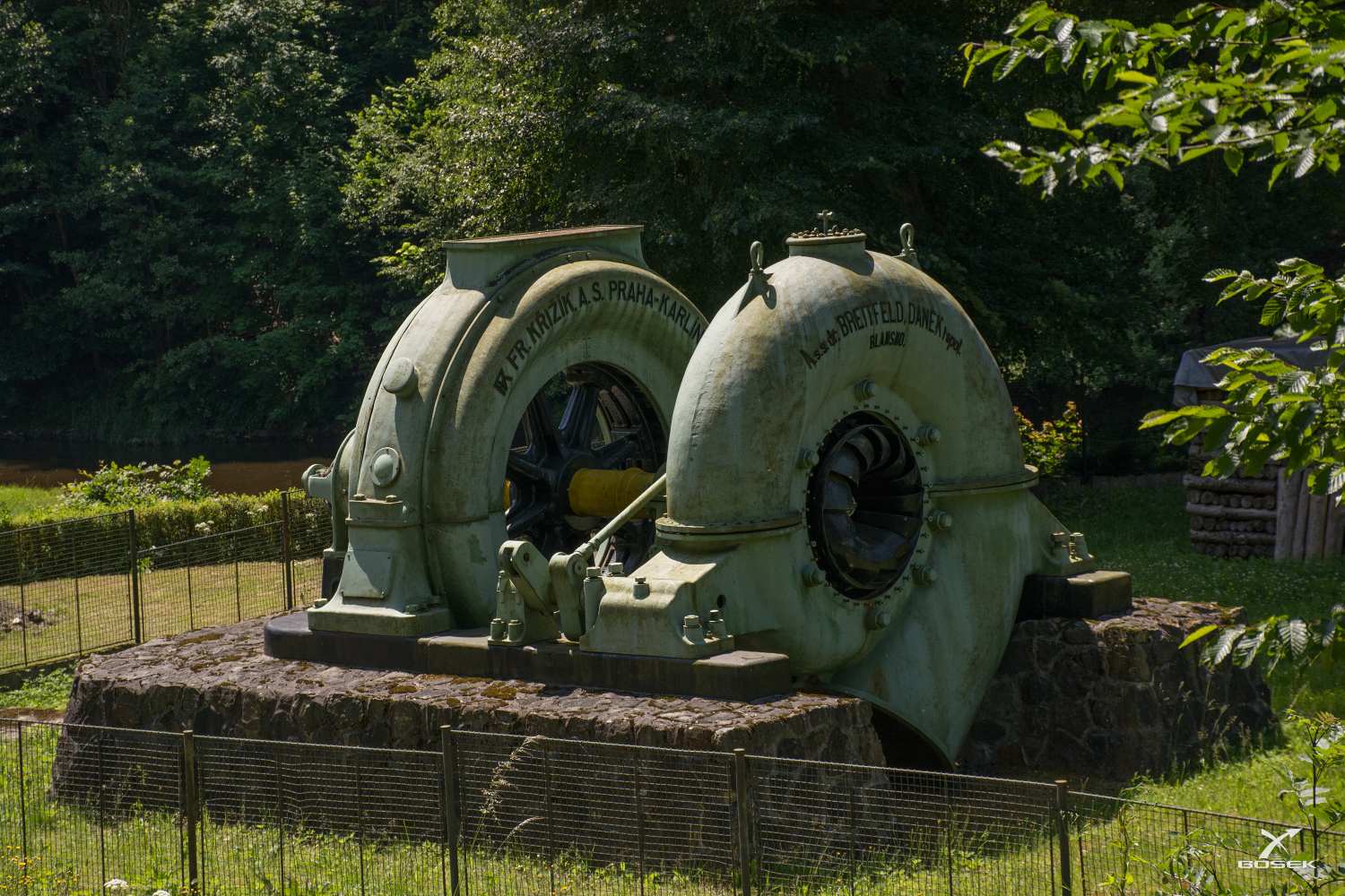 Přicházíme ke krásné soustavě Francisovy turbíny a generátoru. Tyhle soustavy byly v elektrárně tady ve Spálově dvě a sloužily od roku 1926 až do roku 1998, kdy byly vyměněny za Kaplanovy vertikální turbíny. Díky tomu vzrostl výkon ze dvou mega na 2,4 MW. Vracíme se do hotelu, stánek tu nikde není.