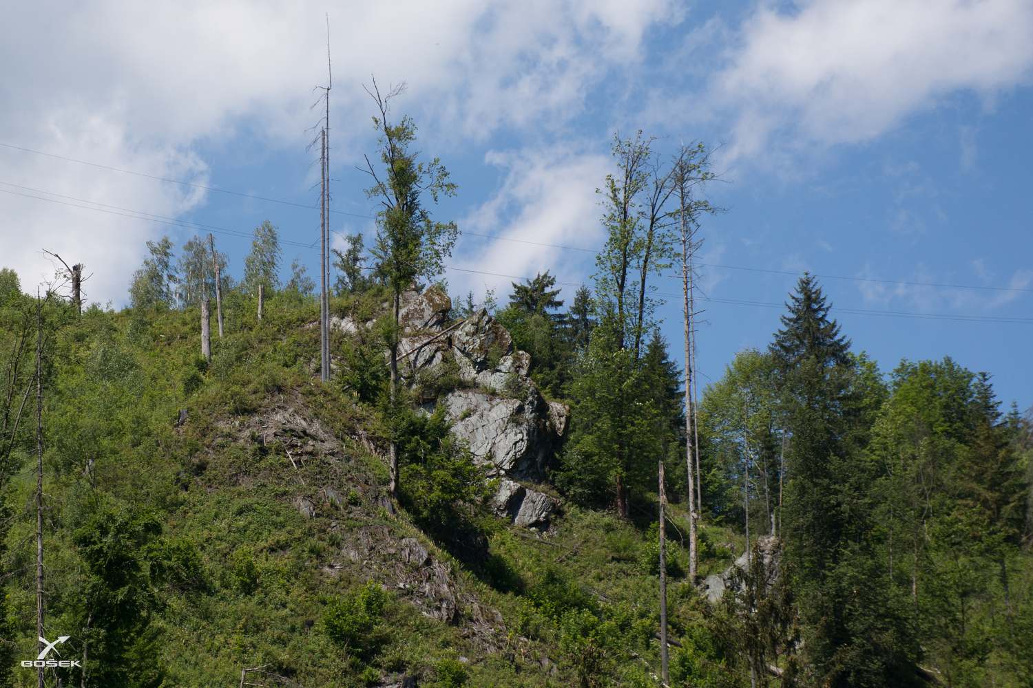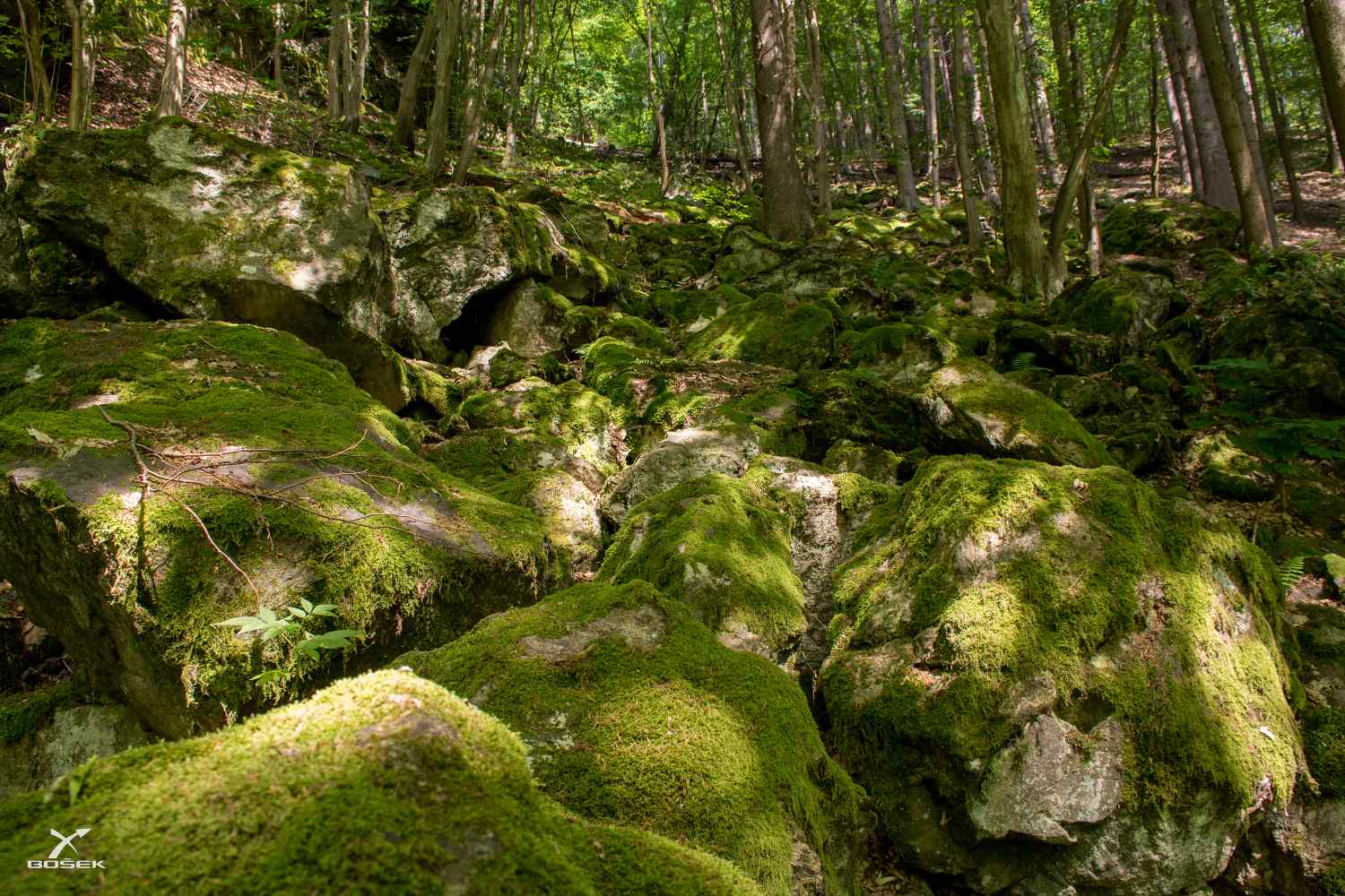 Míjíme krásné suťoviště. No, suťoviště. Je to stráň plná velkých krásně zamešených balvanů. Šutry, kam až oko dohlédne.