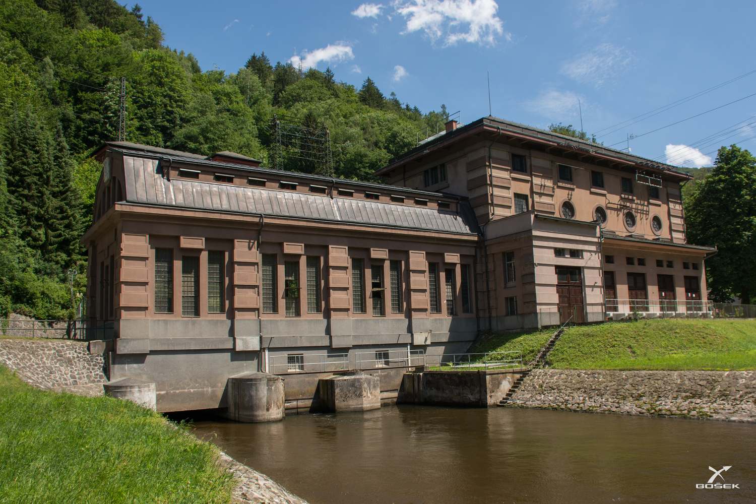 Z hospody jsme sešli dolů k Jizeře, chtěl jsem si odsud cvaknout tuhle krásnou a stále funkční elektrárnu z počátku dvacátých let dvacátého století. Vždycky musím hodně přemýšlet, jak ten časový údaj správně napsat. Je v tom bordel, dvacátá léta jsou až po roce dvacet, ale dvacáté století je před rokem dva tisíce.