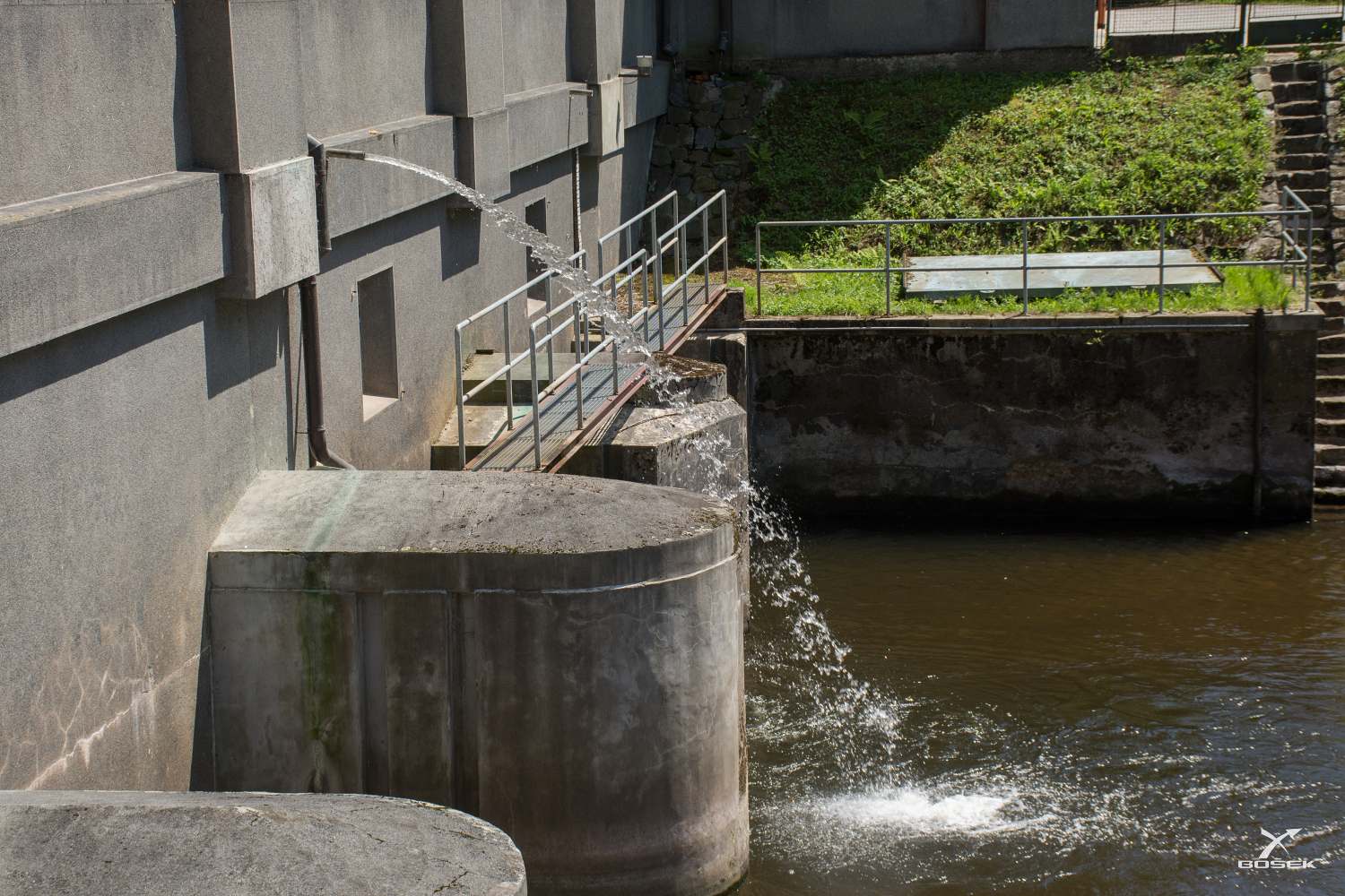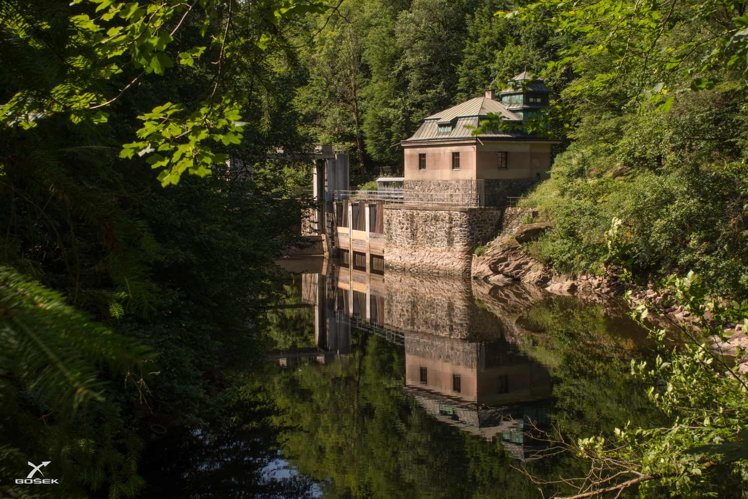 Přicházíme až k zajímavé stavbě. Na první pohled by to mohla být elektrárna, ale není. Je to jez přes Jizeru, který vede vodu do proražené štoly dlouhé 1323 metrů a pak skoro půl kilometru (437m) dlouhým zděným krytým kanálem až do elektrárny ve Spálově. Úžasný sto let starý dílo. Na ceduli na domku píšou, že tu žil nějaký slavný olympionik, v životě jsme jeho jméno neslyšeli a já si ho ani teď nezapamatoval. Takže už se to asi nedozvíme.