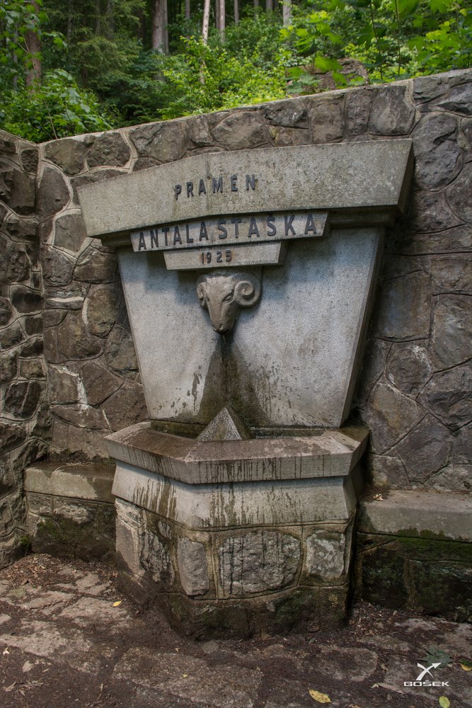 Stoupáme zpět k hotelu a dál nad něj. Už jsme na Riegrově stezce. Spisovatel Antal Stašek, pravým jménem Antonín Zeman, byl občanem nedalekého města Semily a působil tam jako advokát, proto tady má studánku. Tu vybudoval v roce 1925 místní Klub českých turistů. Voda ze studánky prý není podle mapy.cz pitná, ale nikde přímo na místě jsem se to nedočetl.