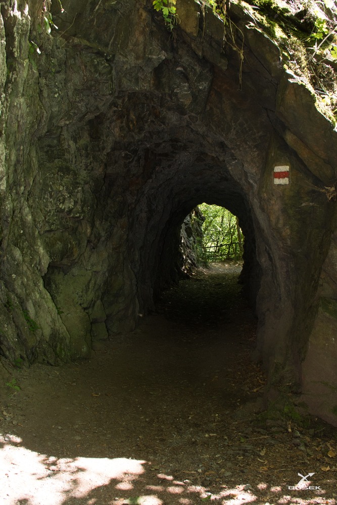 Došli jsme až k jedinému tunýlku na stezce. Vzpomněl jsem si na loňské Svatojánské proudy, kde jich je několik. I tenhle je kouzelný. Hned za tunelem je lávka se zábradlím na levé straně u skály. Blik, blesklo mi pamětí, tady jsme fotili v roce ´97 Erbiho bez hlavy a s pádlem na zádech. Říkám to Janče a ona, že hned za tunelem byla cedule, že je tady v zimě ledopád. Tak je to fakt ono, to místo.