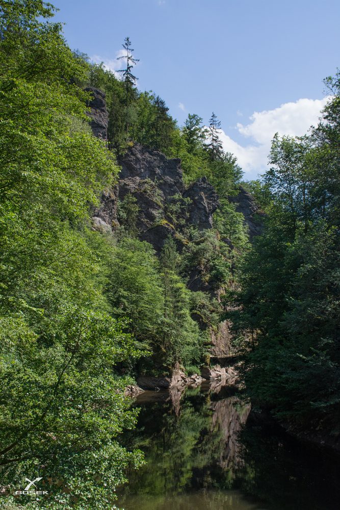 Došli jsme až na konec pěšiny a dál půjdeme po asfaltu. Tady ústí do Kamenice říčka Vošmenda. Tyhle skály taky vypadají úžasně, ale na fotce to určitě vidět nebude. „Smazat ji můžu vždycky, to je výhoda digitálu.“ Nevýhoda je, že musí být člověk víc sebekritický. Když má možnost zadarmo nacvakat tisíce snímků, měl by si zamilovat tlačítko Delete. Ani já ho ještě neovládám dokonale a občas zachraňuju fotku, co bych měl vyhodit. Naštěstí u focení trochu přemýšlím a nenacvakám tisíce snímků a můj „příběhový odpad“ je tudíž asi jen deset procent.