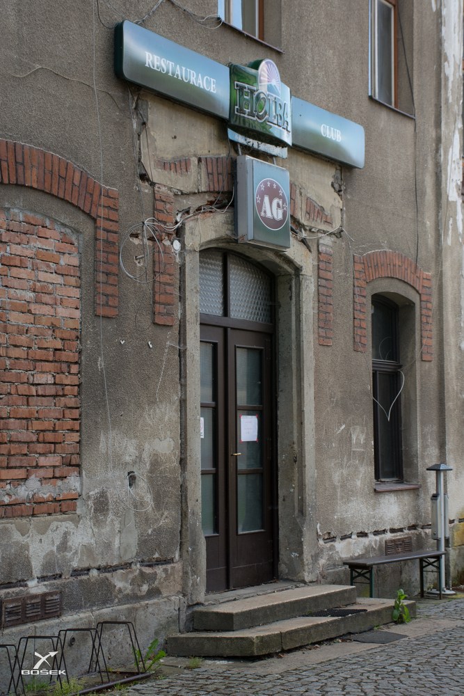 Jdeme kolem vybydlených baráků, co dřív patřily k místní fabrice. A jsme u hospody. No, nevypadá zrovna nejlíp, a navíc je na dveřích cedule „Dočasně zavřeno“. Co teď?