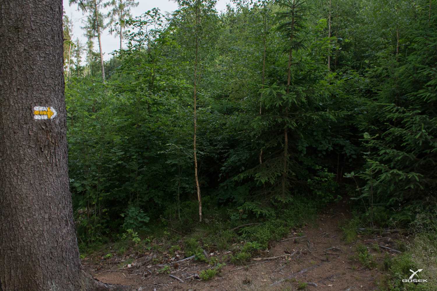 Odbočuju doleva a říkám Janče, že je to tu s tím značením tras na stromech fakt slabota. Ona tahá mobil: „No ještě aby ne, jdeme blbě.“ Vracíme se tedy asi tři sta metrů zpátky a jdeme po proudu na správnou stranu.