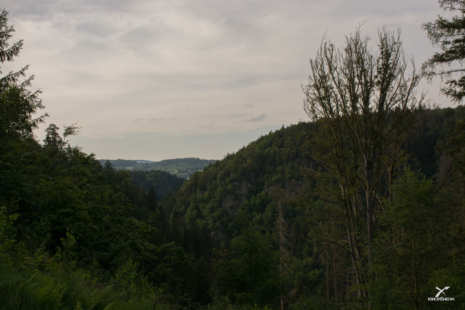 Hned o necelých sto metrů dál je další vyhlídka, Böhmova. Název získala po jednom ze zakladatelů a prvním předsedovi KČT Semily, Antonínu Böhmovi. Je odsud nádherný výhled až dolů na Jizeru a na protější svahy. Tam vzadu po tom kopečku večer taky půjdeme.